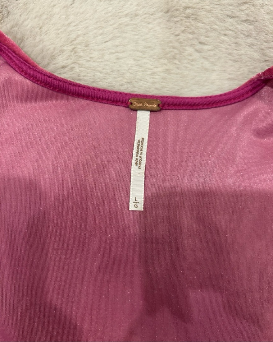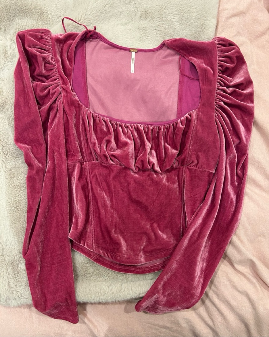 Pink velvet free people top has only been worn once. The shoulders have great structure and it’s such a unique and fun top. First true to size.