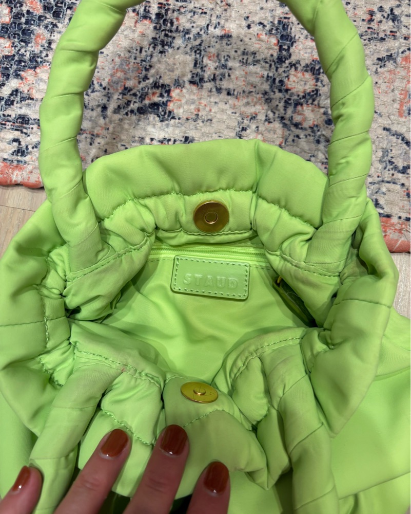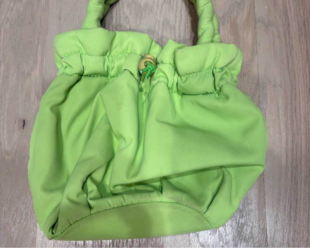 This eye-catching puffed tote bag in a vivid green hue is perfect for adding a pop of color to any outfit. The roomy interior and comfortable, adjustable straps make it a versatile accessory for everyday use or a night out. 8.5” high. Handle drop 3.5”. Nylon lining and single interior pocket. Oh