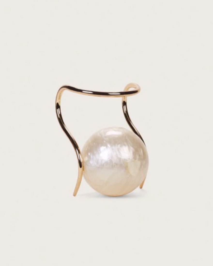 The most gorgeous bag ever!!!! The Pearl Bag is a true Objet d'Art. This bag has a clasp open top, featuring a gold oblong handle. Wear this on your arm like a bracelet, or hold by hand.