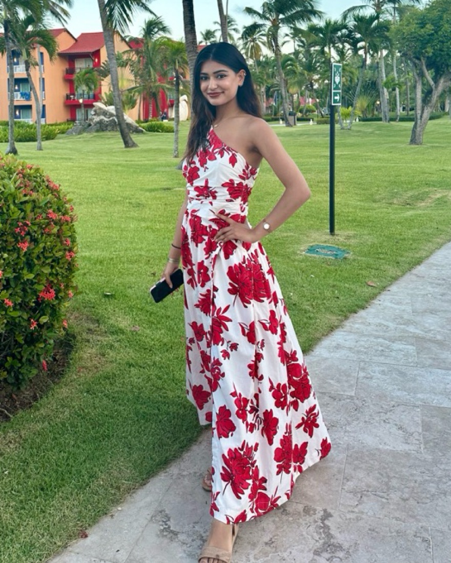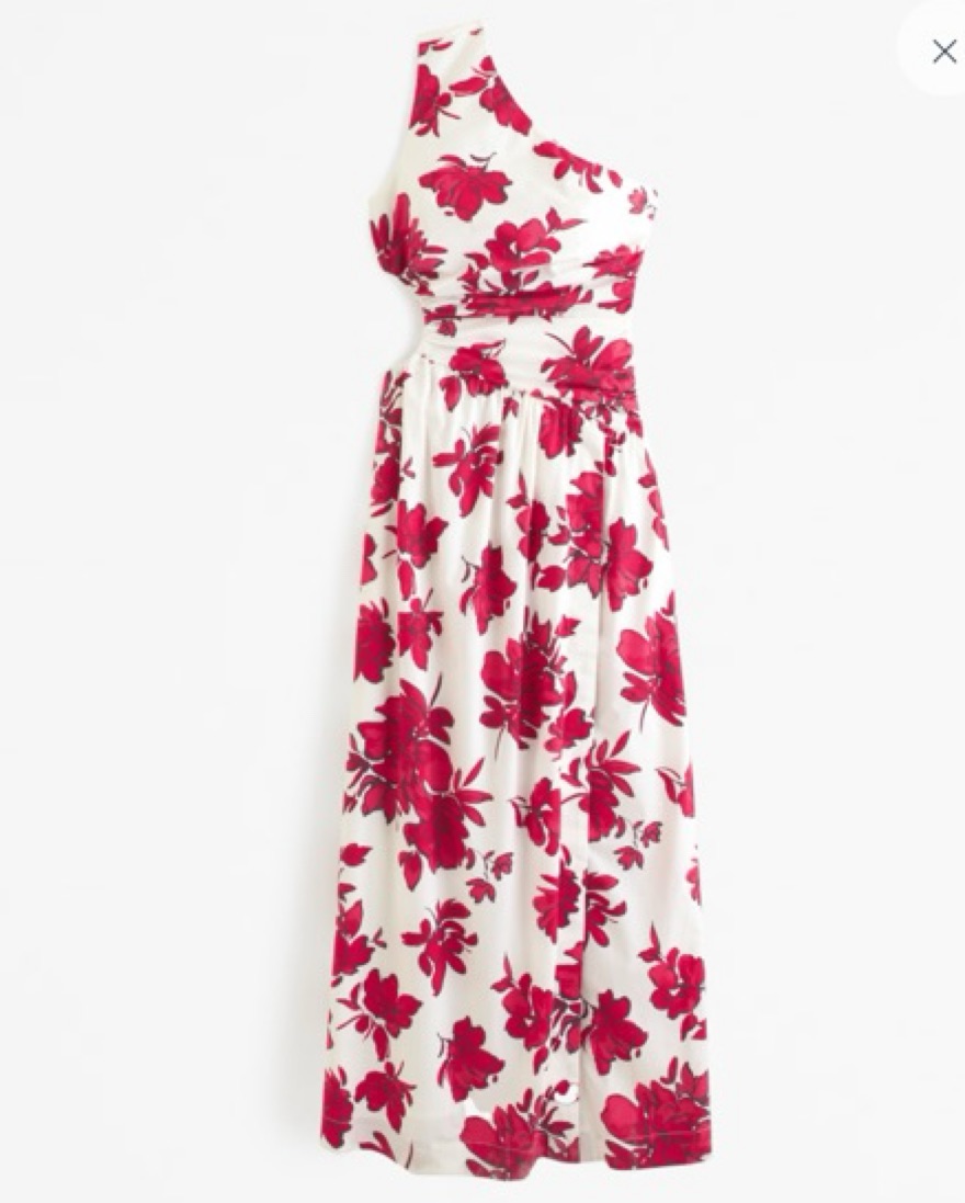 Super cute one shoulder abercrombie red floral dress with cut out on the side and slit. Perfect sun dress.