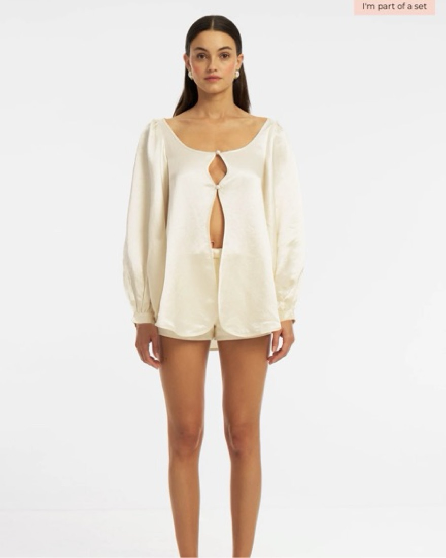 The viral bubish Penelope blouse and short set in cream. Perfect set for spring and summer and for brides. Tags: bridal, summer, revolve, matching set, asta resort, reformation, cult Gaia, rat & boa