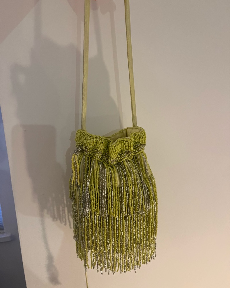 Green and silver beaded and tasseled silk bucket bag. Bought in Portugal.