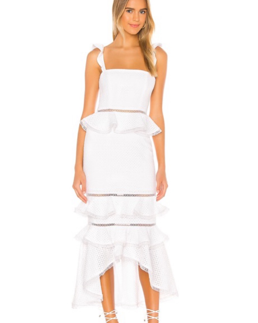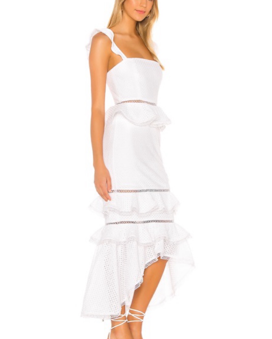 This beautiful white midi dress features a flattering silhouette with delicate ruffles and a tiered skirt, perfect for a cute brunch or a special occasion.