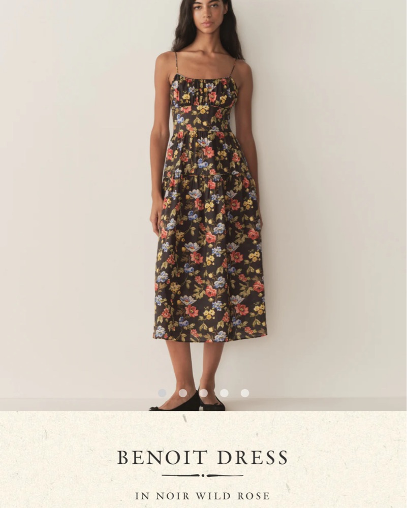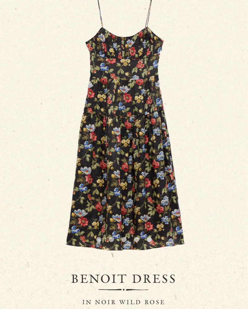 Doen Benoit Dress in Noir Wild Rose. Completely sold out online, as seen on Taylor Swift! Flattering and comfy floral Doen dress.