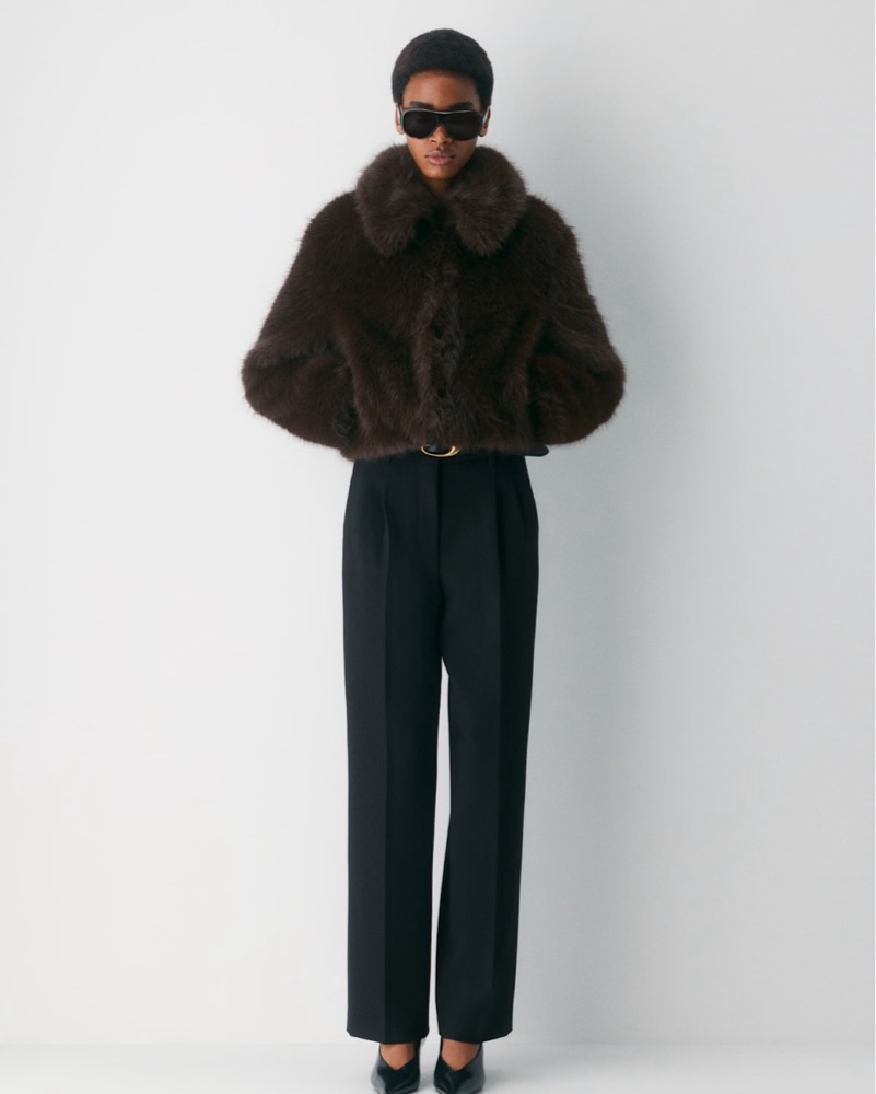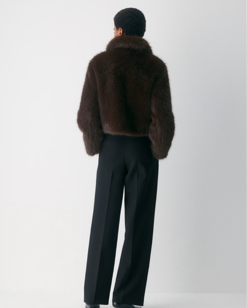 This is a lined, single-breasted coat with inseam pockets. It’s made with Arctic Faux Fur — ultra-plush faux fox fur that looks and feels like the real thing. The most gorgeous brown shade!