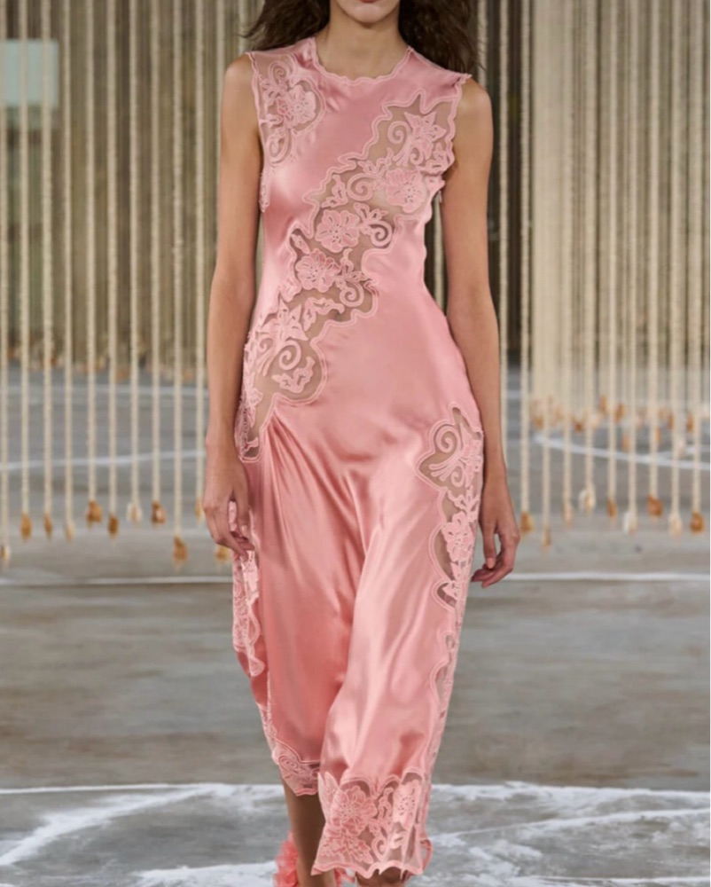 the Kaia Dress is beautifully cut on the bias from silk charmeuse with tulle adorned with floral appliqués. This gorgeous pink frock features a floaty asymmetric hem and has a removable slip. It is finished with delicate ties at the open back and a side zipper closure.