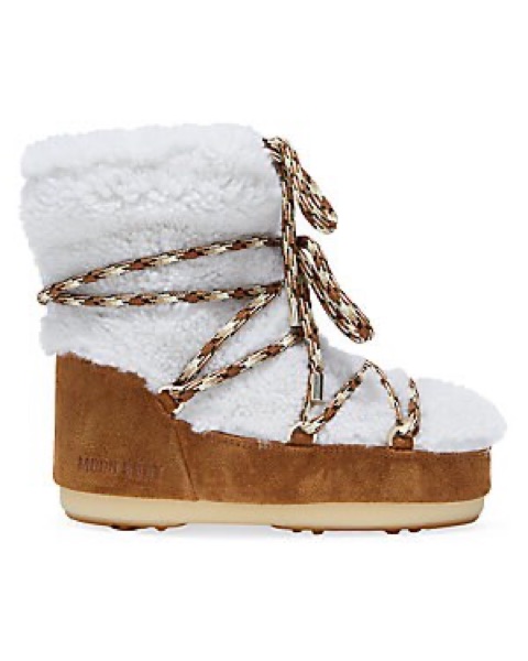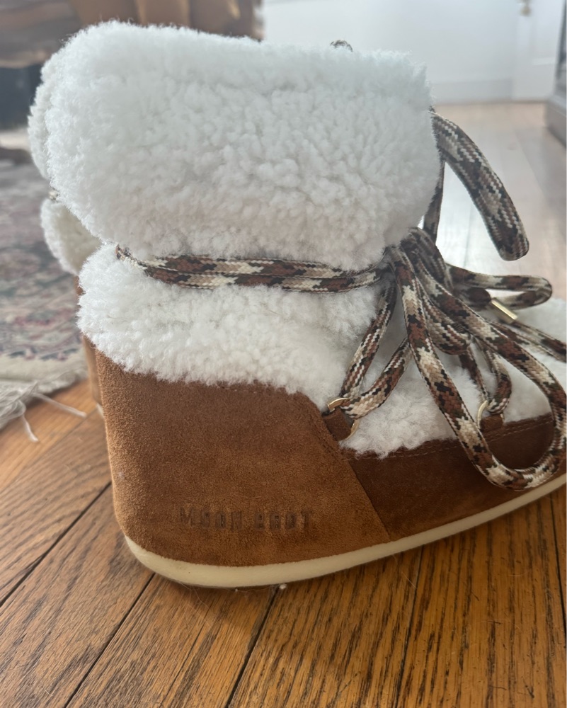 Cutest snow boots!! Shearling and suede upper with adjustable laces. Rubber sole with bits for extra traction. Size is 39/41, which fits US women’s sizes 7.5-10. I’m a size 8 and fits me perfectly with chunky socks.