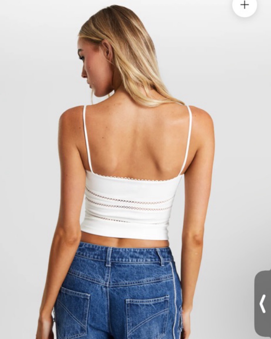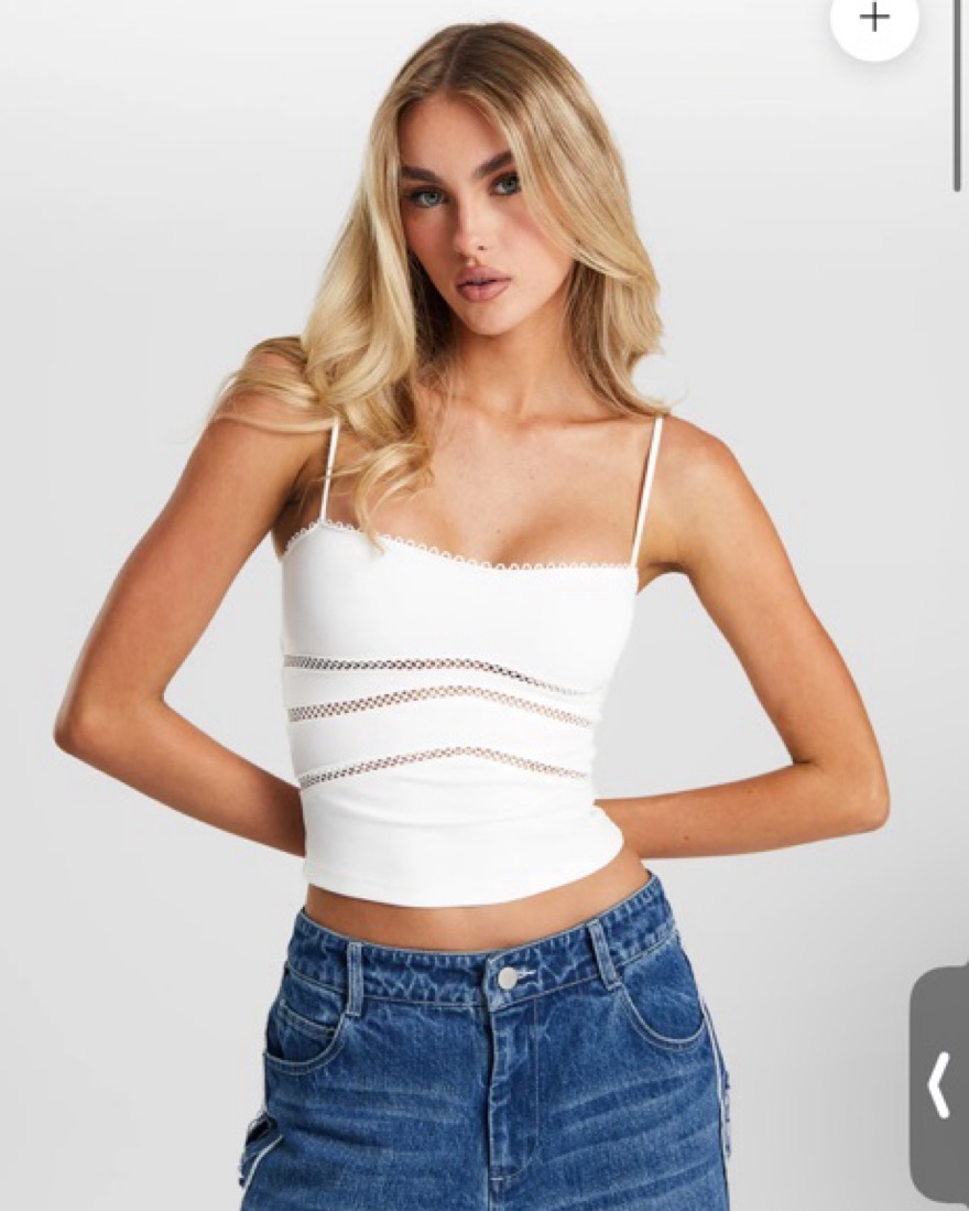 White tank top with dainty straps and a picot crochet trim at the neckline and under bust panelling. Very feminine and chic, perfect elevated top for all occasions day or night! NWT - never been worn.