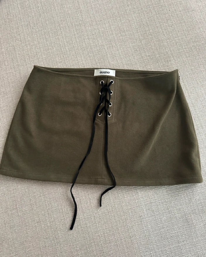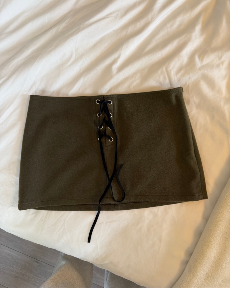 This olive green mini skirt features a lace-up front closure for a stylish, eye-catching look. It's perfect for a night out with friends or a casual date.