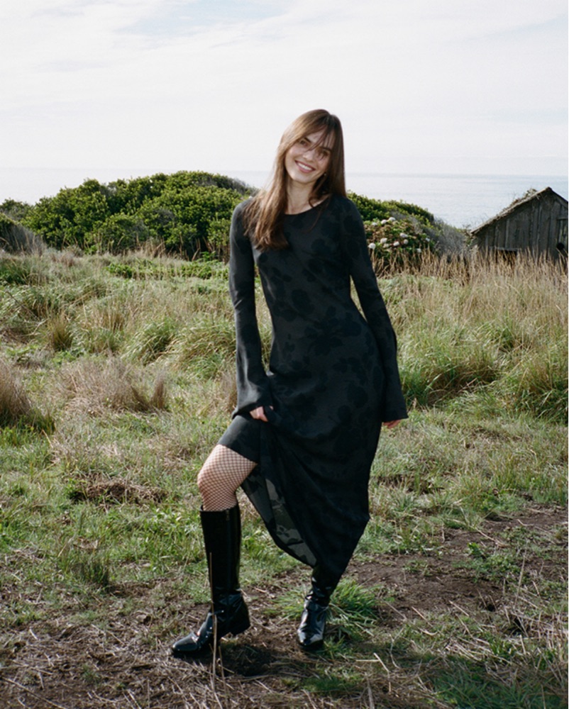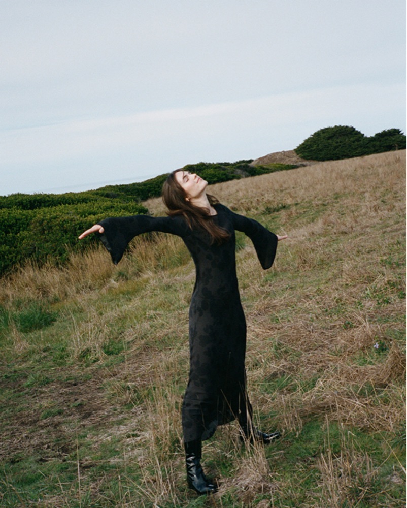 Realisation Par The Gia in Midnight Rose. Full length maxi dress with long bell sleeves