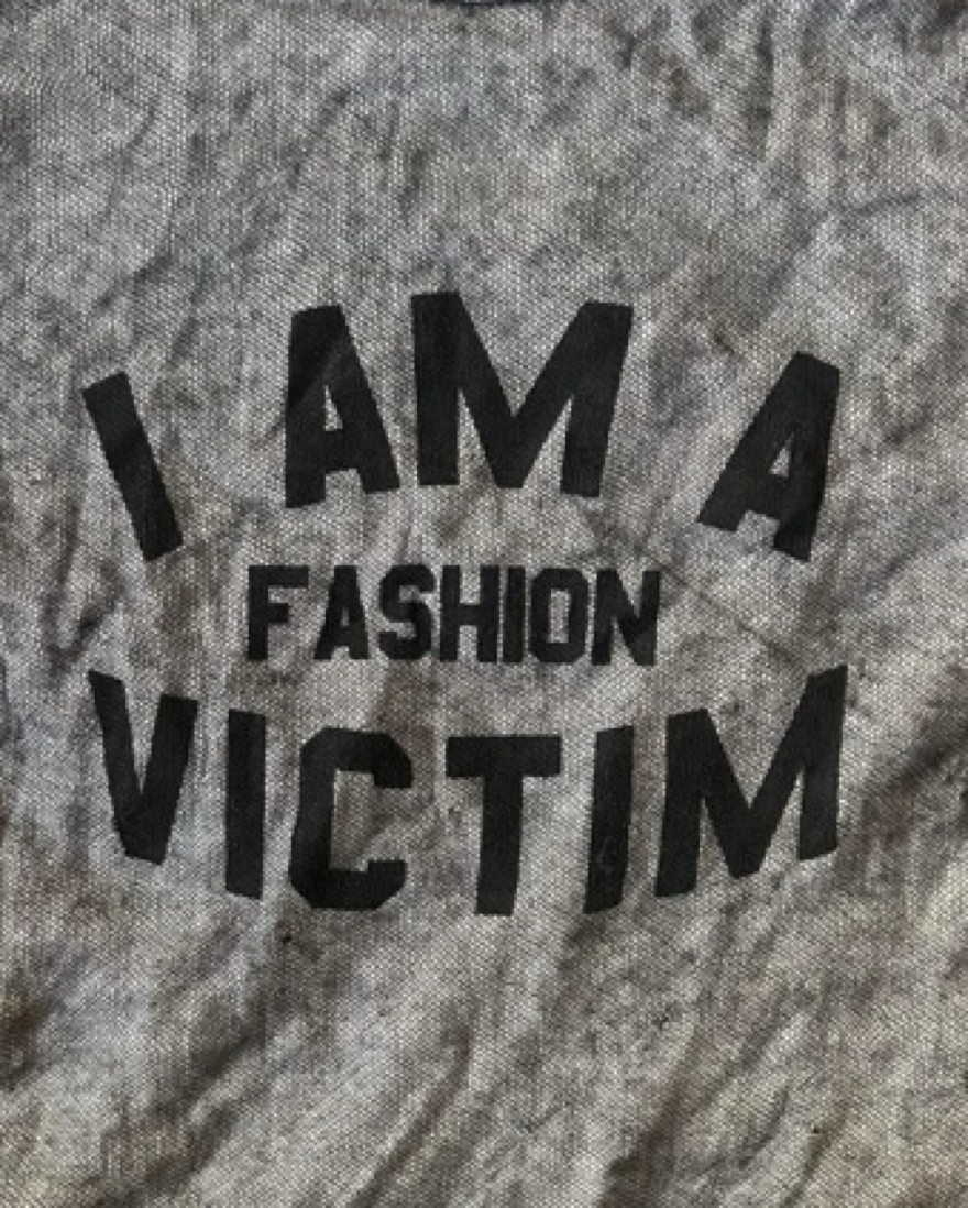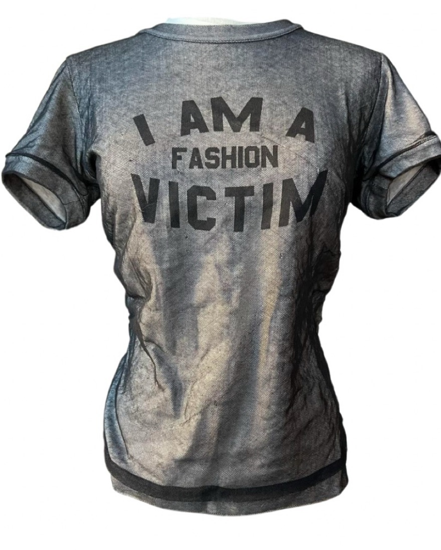 Vintage Dolce & Gabbana mesh overlay top featuring text “I Am A Fashion Victim” on front. Super cute and fun! Has small hole near graphic that is slightly noticeable if up close. IT40/ US small.