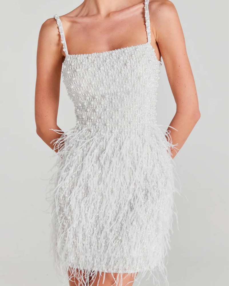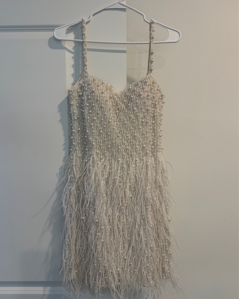 This stunning feather-adorned dress is perfect for a night out on the town. The glittering embellishments and luxurious feathers create a truly show-stopping look. I wore it for my second look at my wedding.