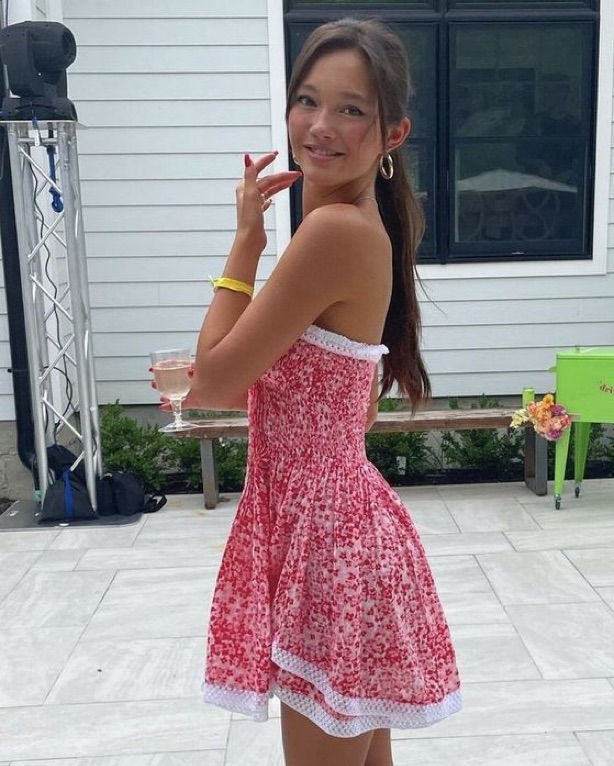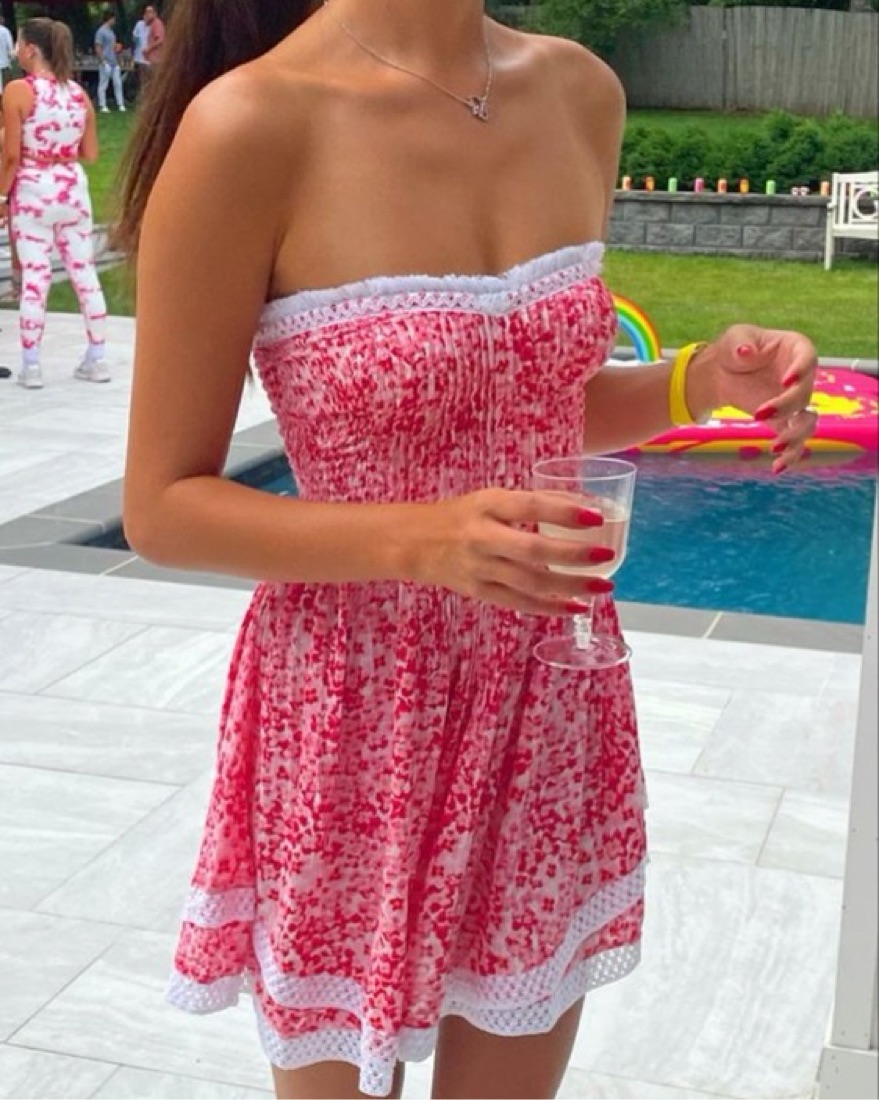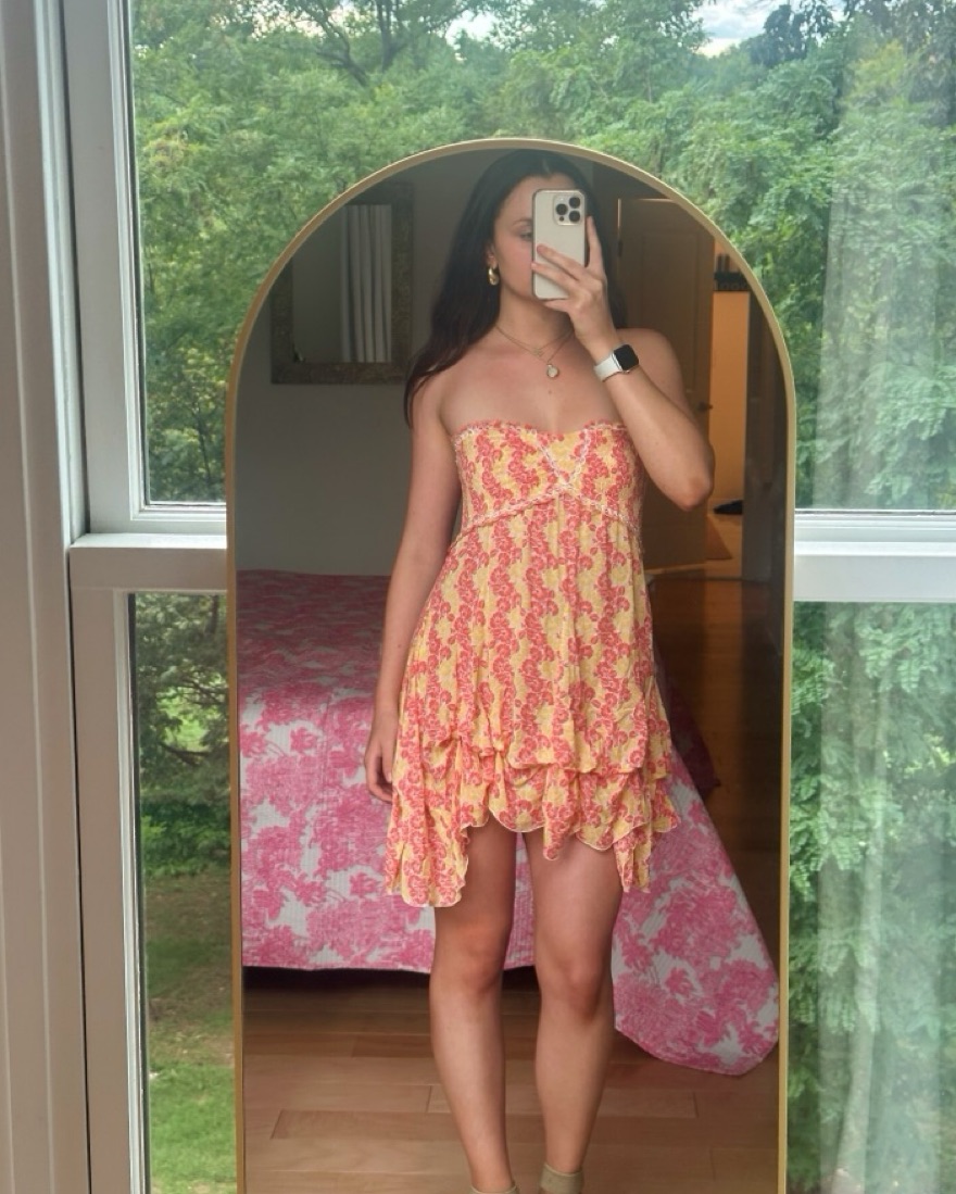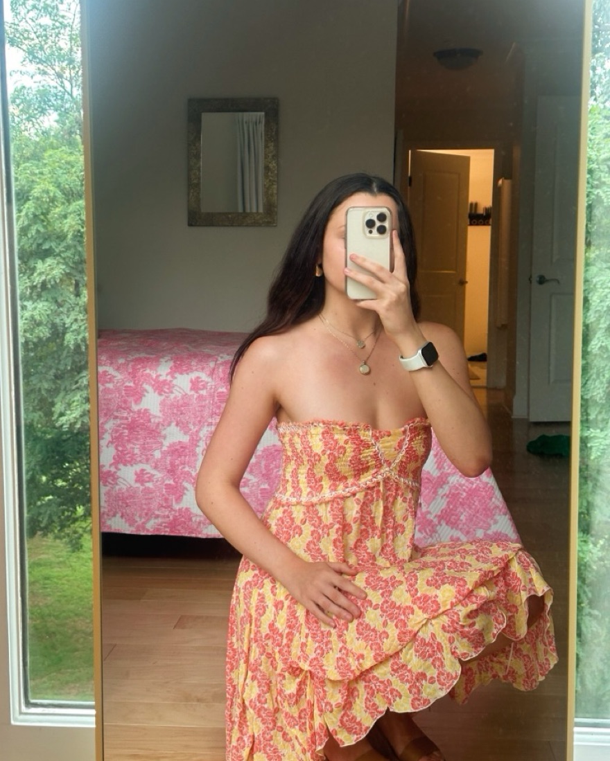 st barth poupette bandeau dress similar to the viral lily chee dress. Dress for rent is orange/yellow. Has a lot of stretch for sizes xs-m