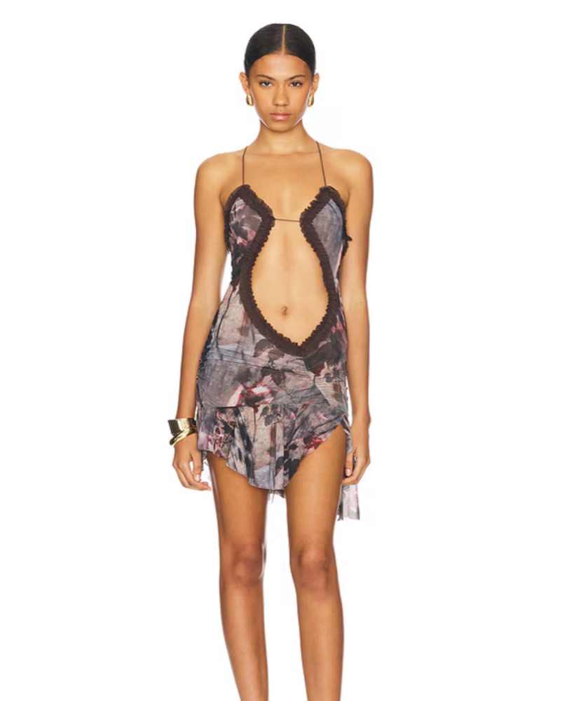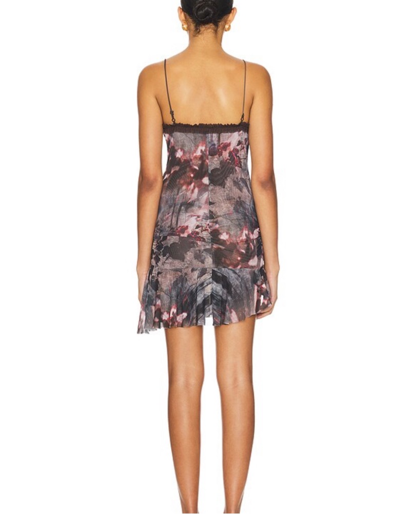 This delicate slip dress features a captivating floral print and a touch of lace. Perfect for a summer garden party or a romantic night out.