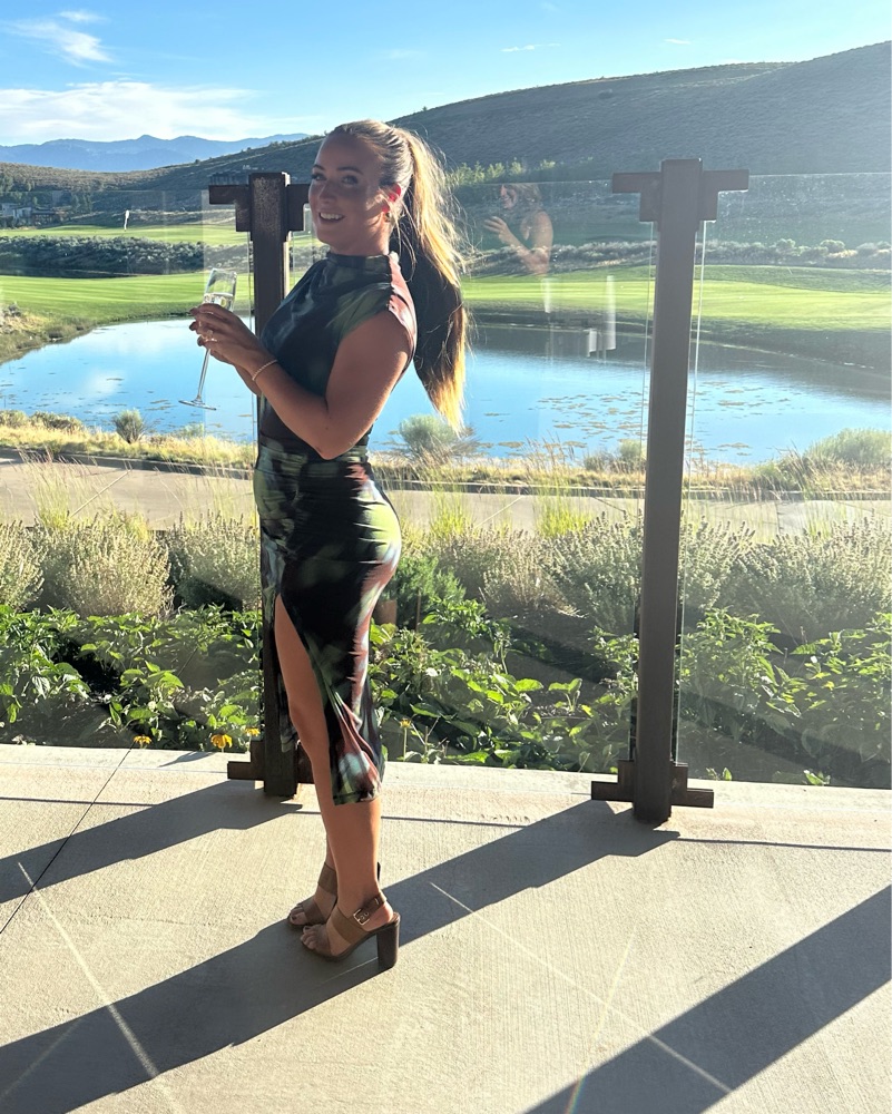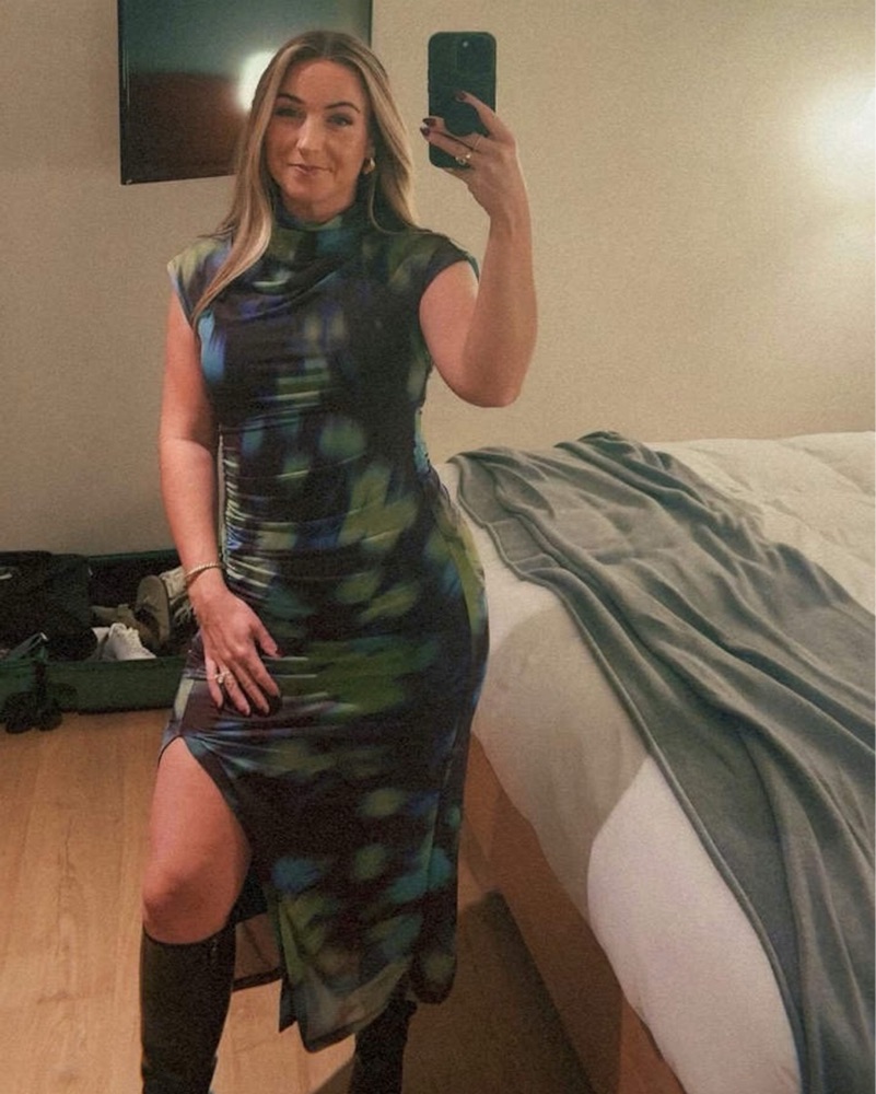 Cowl-neck midi with front slit and allover mesh fabrication with pullover styling