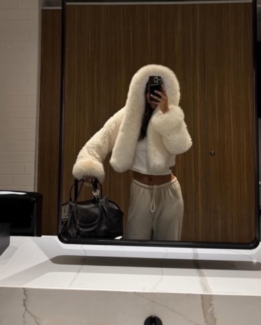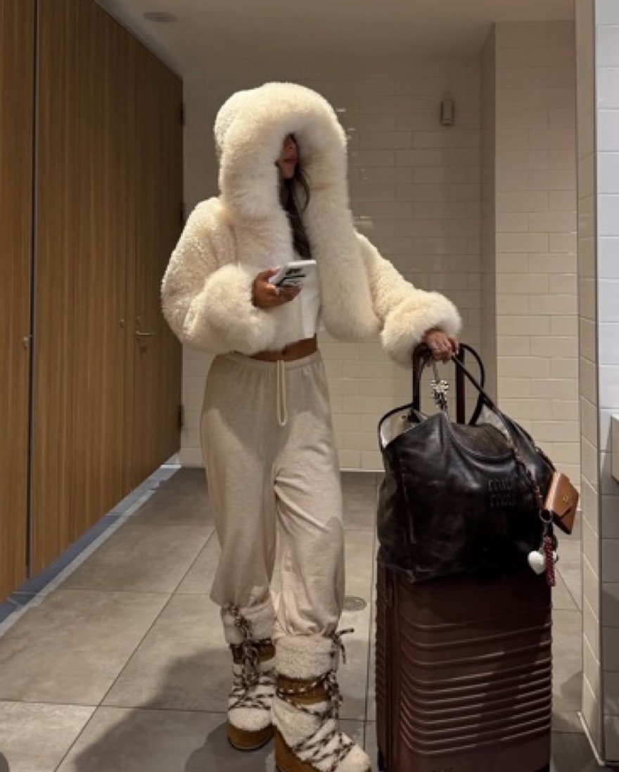 This stunning all-white ensemble is perfect for a chic winter getaway. The oversized faux fur hooded coat and complementary pants create a cozy yet stylish look.