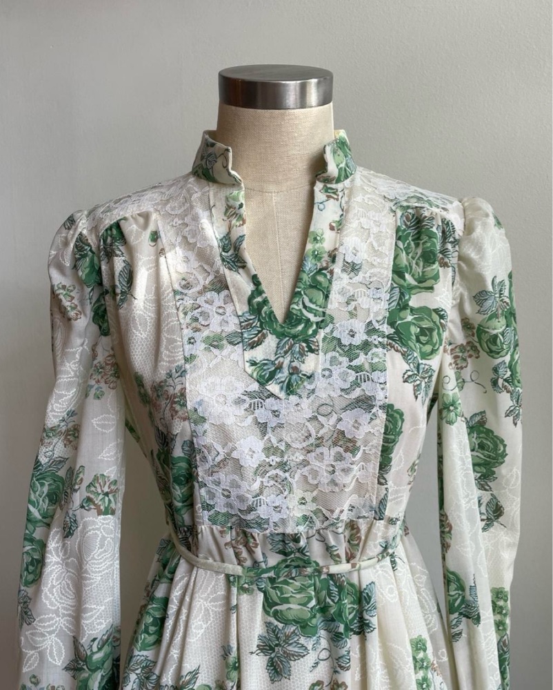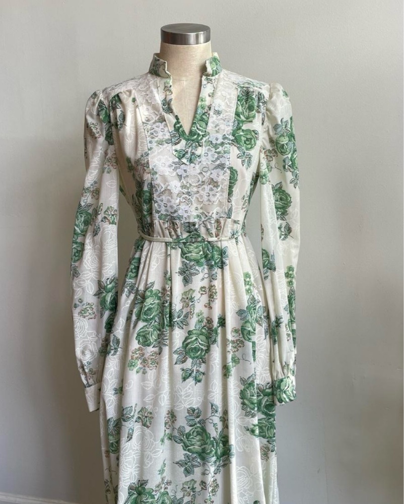 Gorgeous 70’s floral prairie maxi dress with puff sleeves ✨ Love the shades of green, cream and brown on this dress! Major forest fairy vibes. In overall good vintage condition. No labeled size fits size medium, refer to measurements.