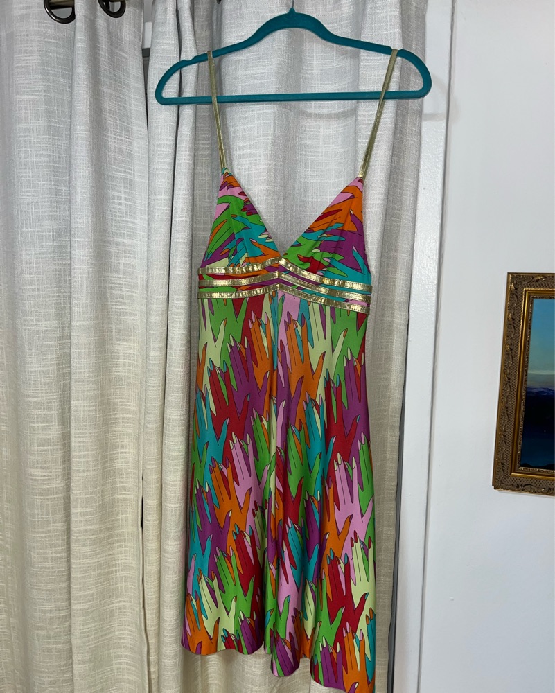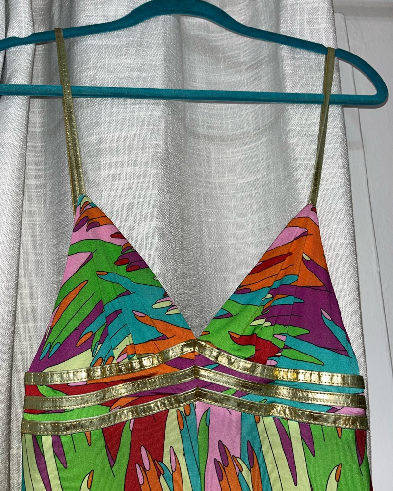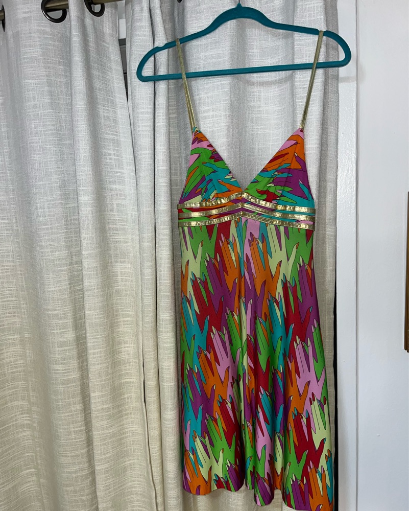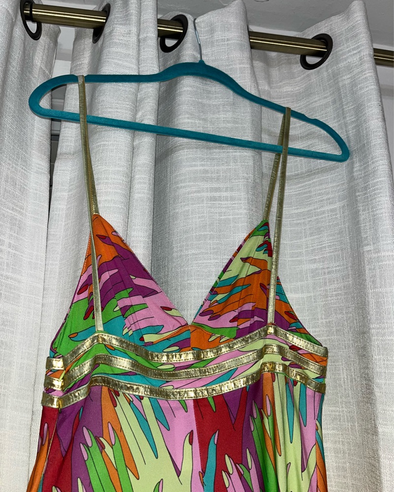 This eye-catching dress is perfect for a summer day or evening event. The bold, colorful print and halter neckline create a stylish, on-trend look. As seen on Bella hadid