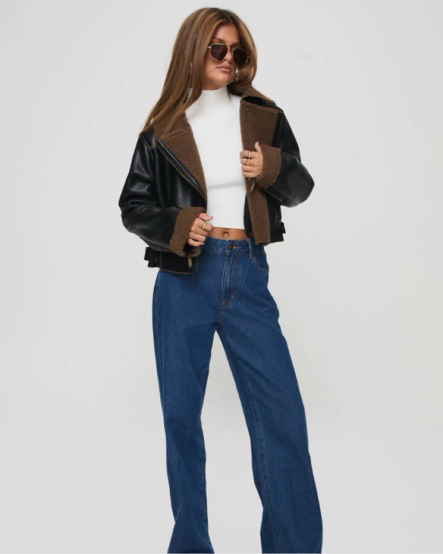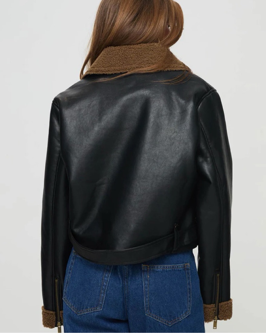 Shearling Trim Faux Leather Jacket Black by Princess Polly - Pickle