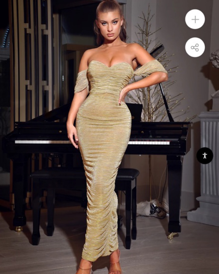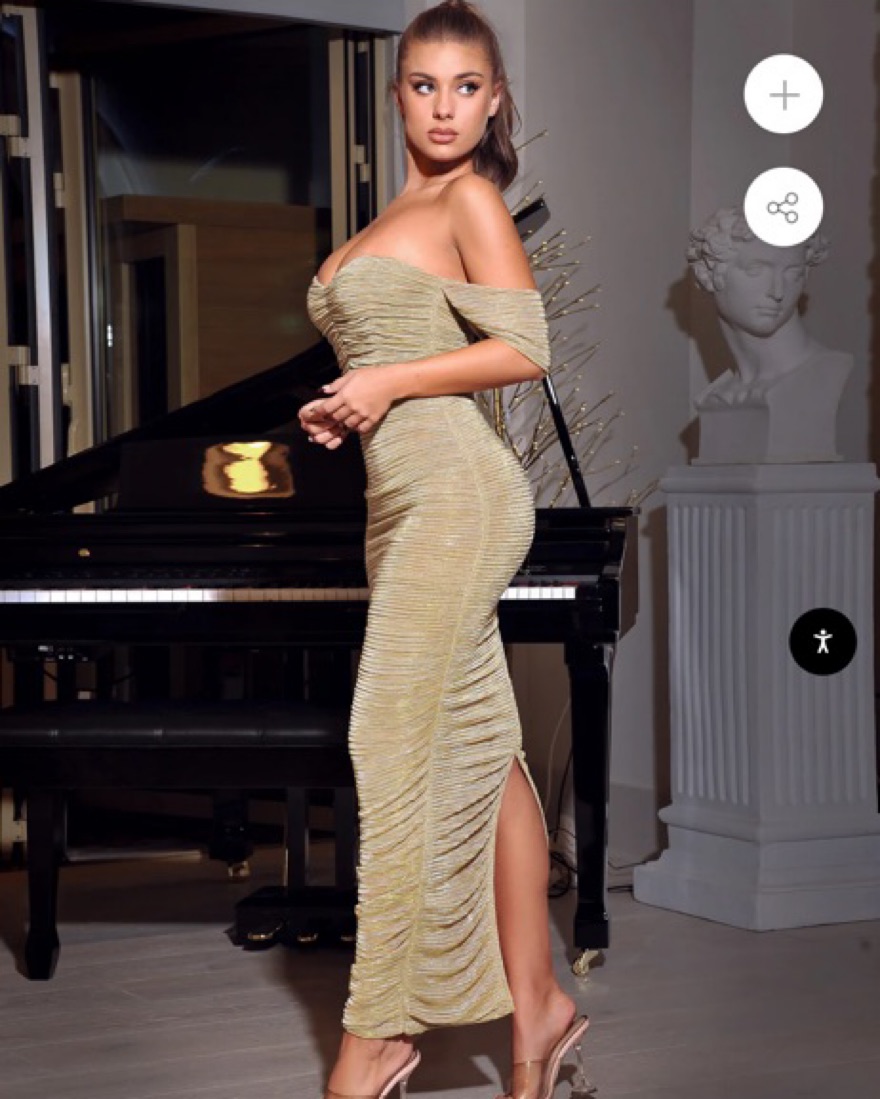 Miss Circle Gold Off Shoulder Dress by Miss Circle - Pickle