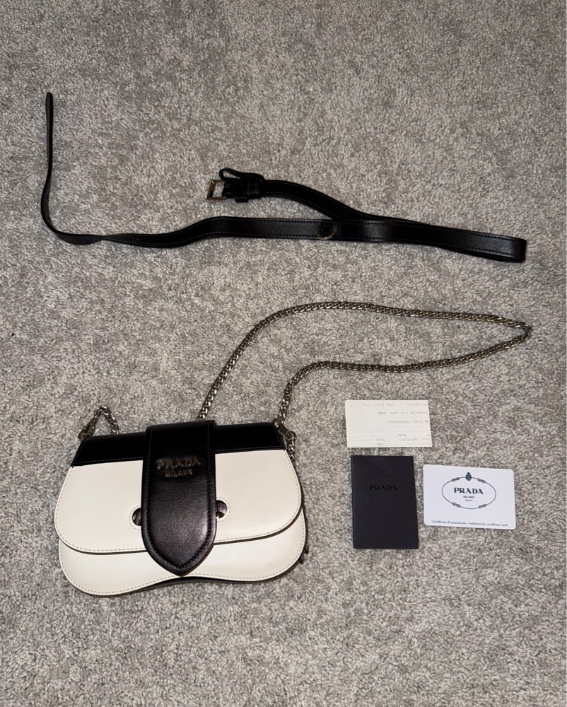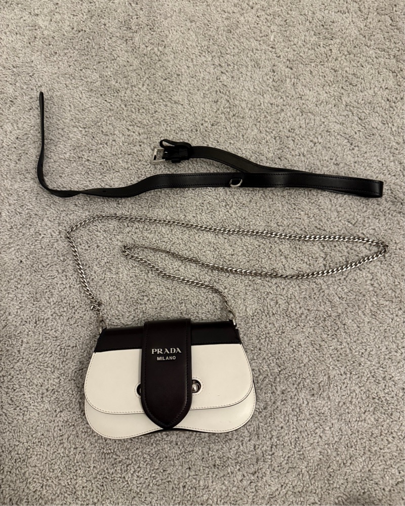 This stylish Prada Milano crossbody bag is perfect for a night out or formal event. The sleek design and high-quality construction make it a versatile and chic accessory.