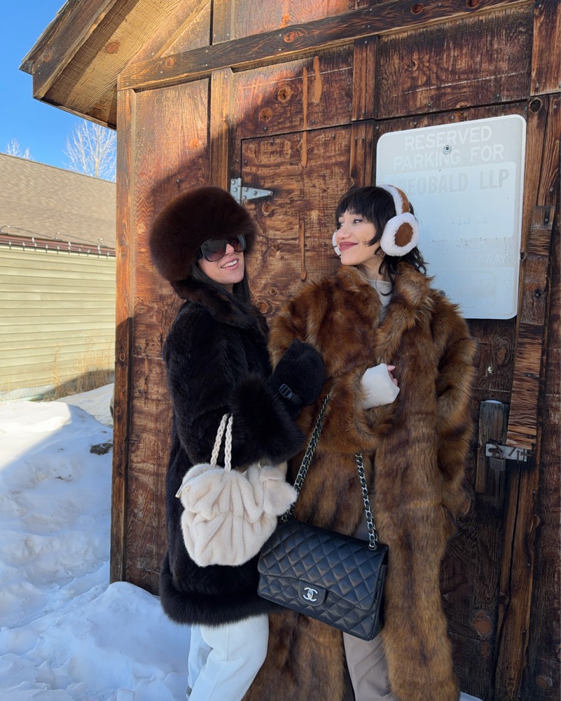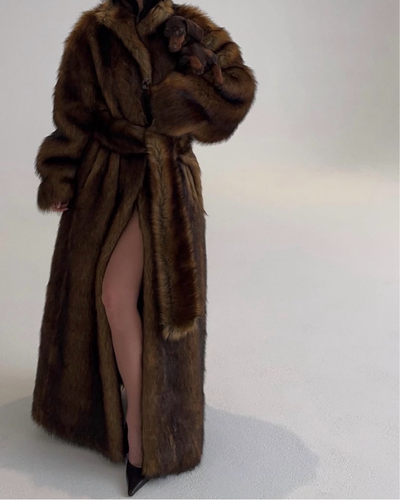 Long luxurious faux fur coat to wear over any winter outfit 🐻🤎❄️ as seen in Aspen, St. Moritz, and the French Alps