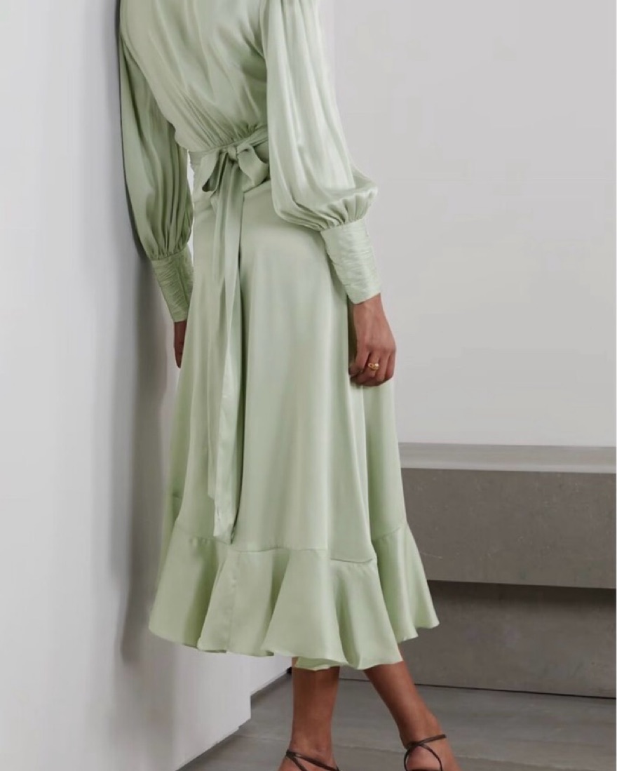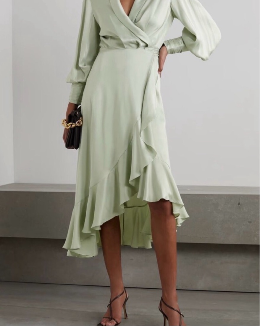 A silk midi dress featuring a wrap silhouette, a fluid asymmetric skirt and plunging neckline, finished with elongated cuffs with zip closures.