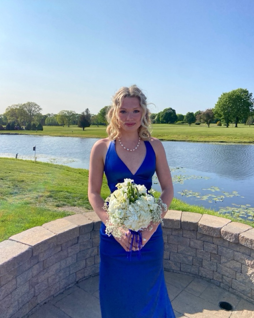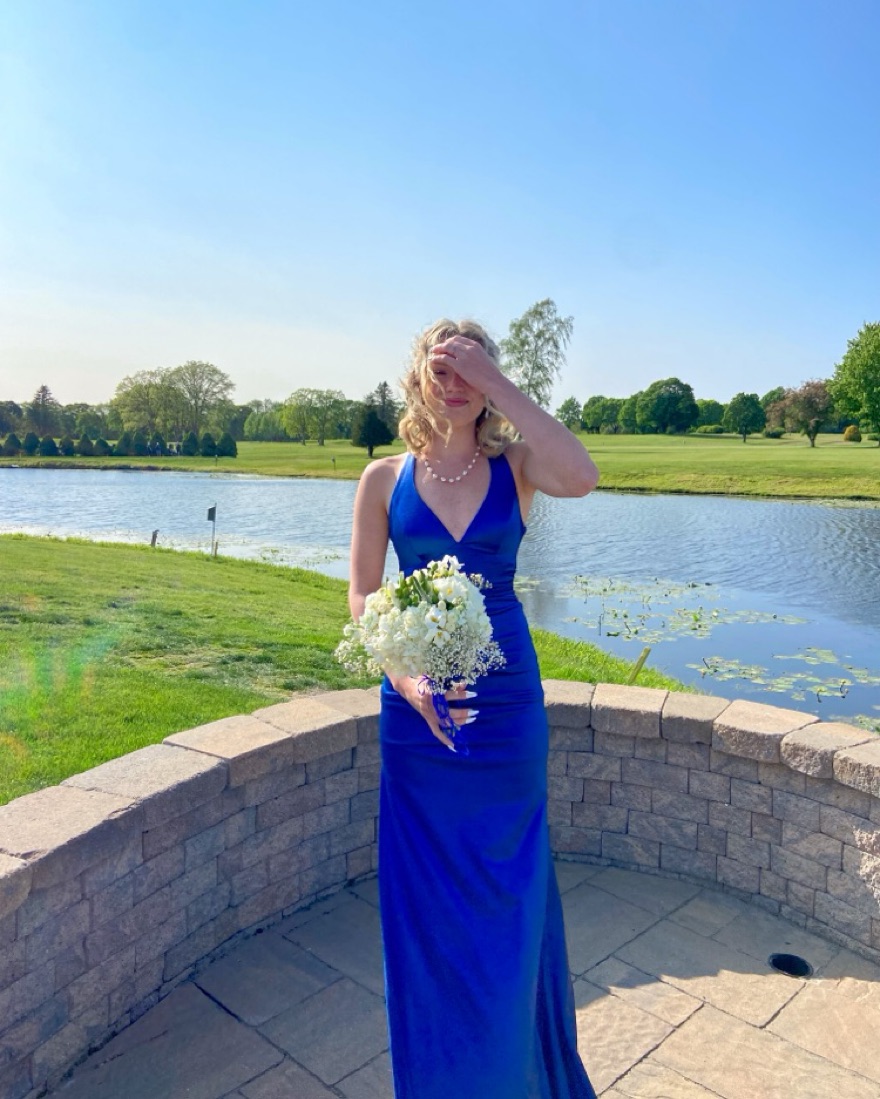 This stunning maxi dress in a vibrant blue hue is perfect for any formal event. The figure-flattering silhouette and beautiful floral bouquet accessory make it an elegant choice for a wedding, gala, or special occasion.