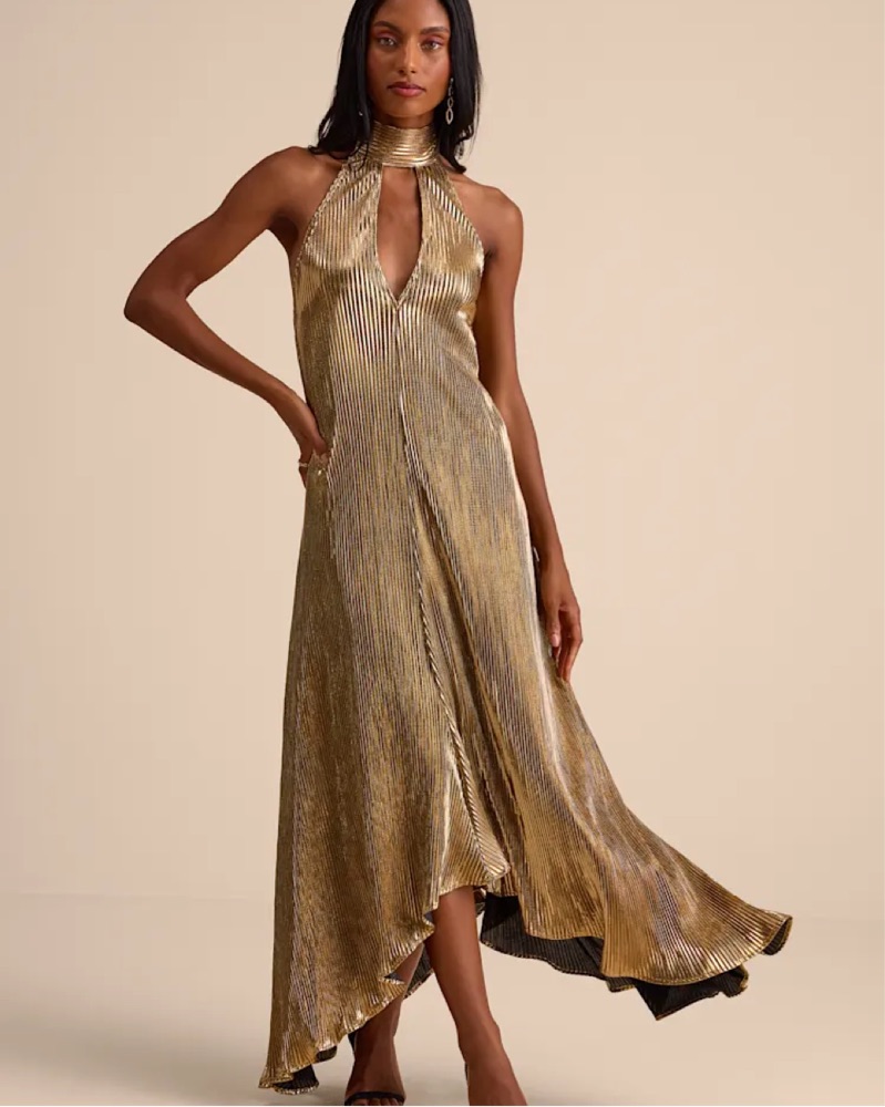This striking gold pleated gown is perfect for a formal event or special occasion. The flowing silhouette and metallic finish create a glamorous, eye-catching look.