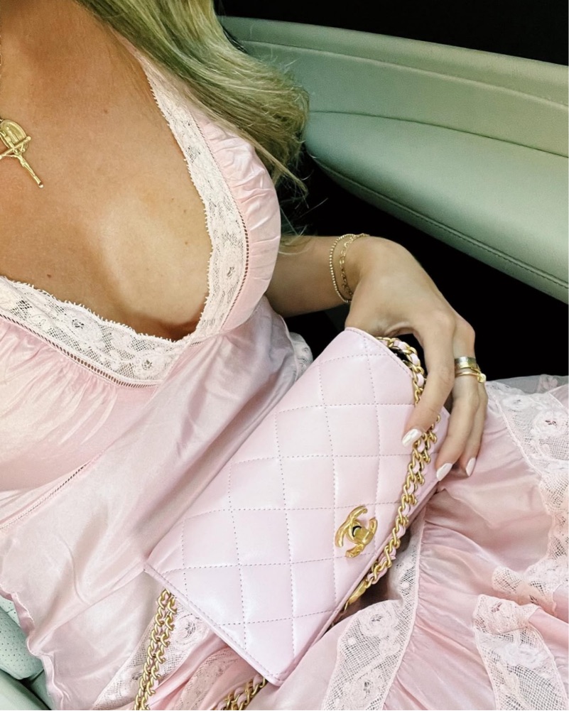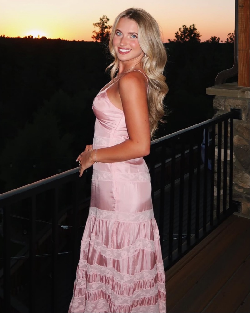 This elegant pink maxi dress is perfect for a romantic evening out. The tiered lace detailing and flowing silhouette create a dreamy, feminine look.