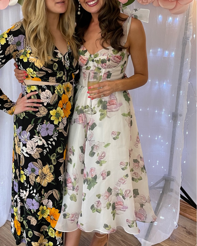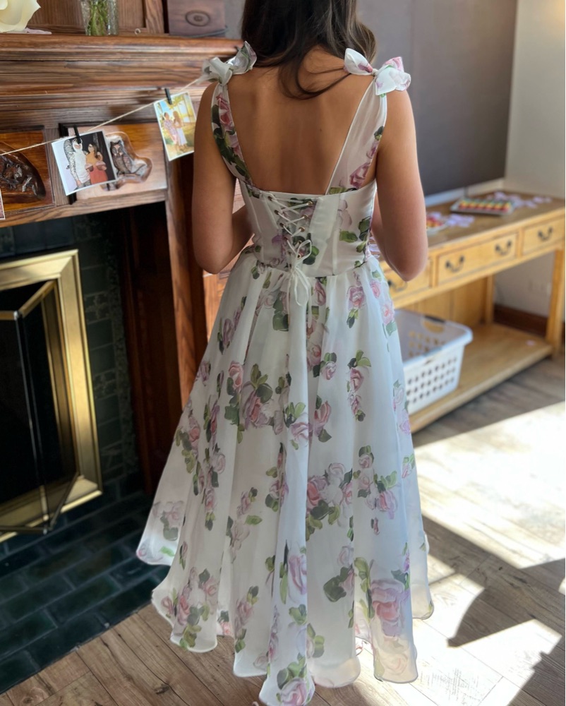 This floaty Mills midi dress features a beautiful floral print in soft hues and a flattering lace-up back detail. Floral tie-strap midi dress with a flaring skirt and full lining. Also features a heart-shaped neckline corset and adjustable tie-straps.