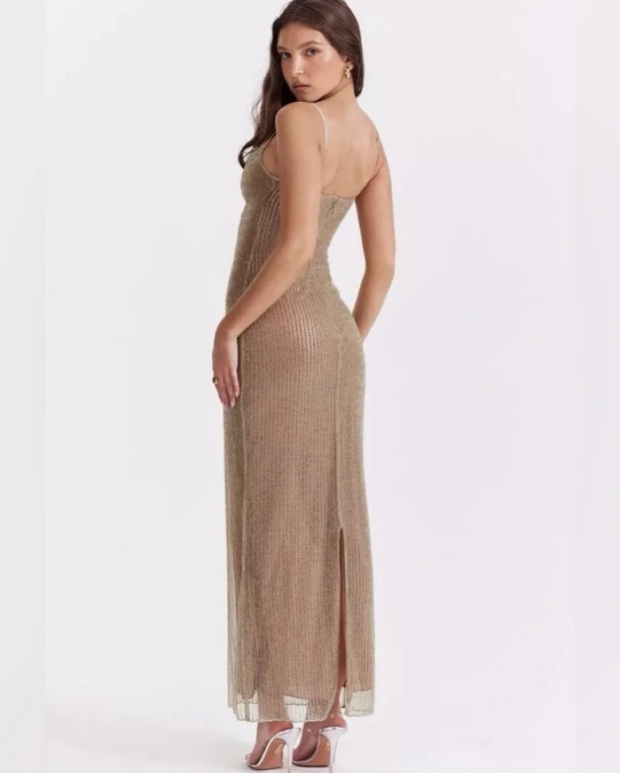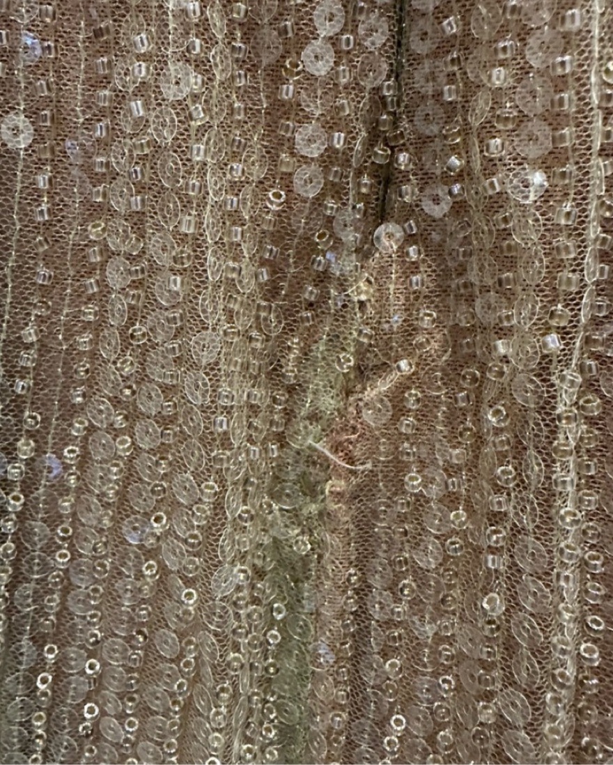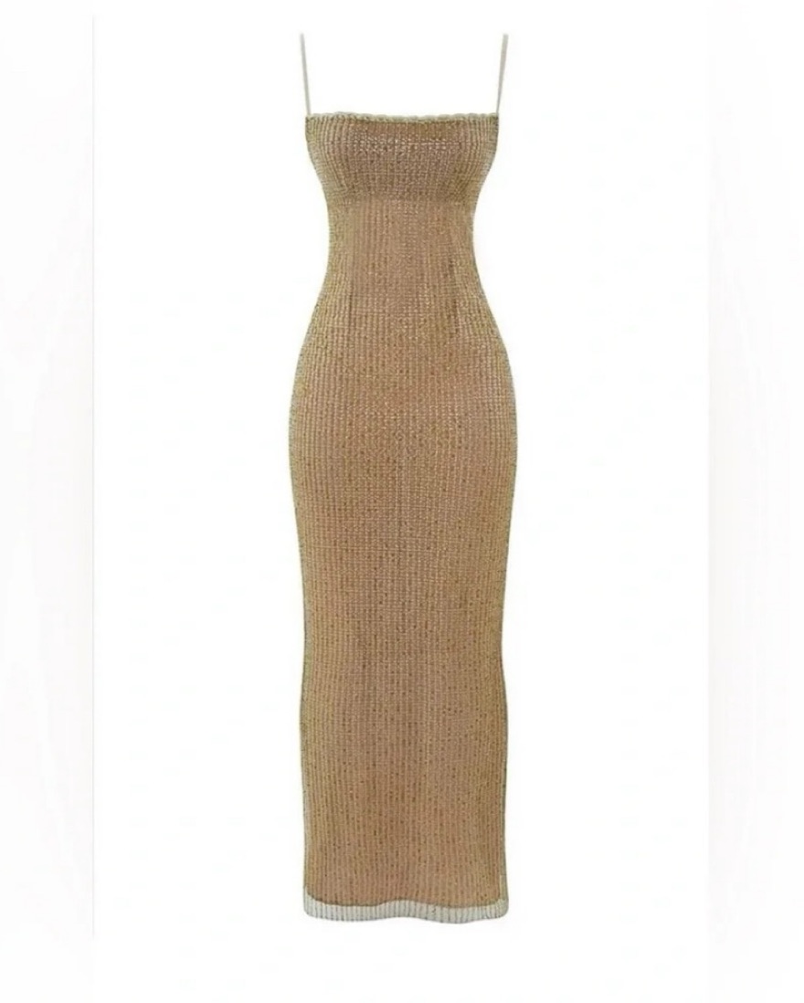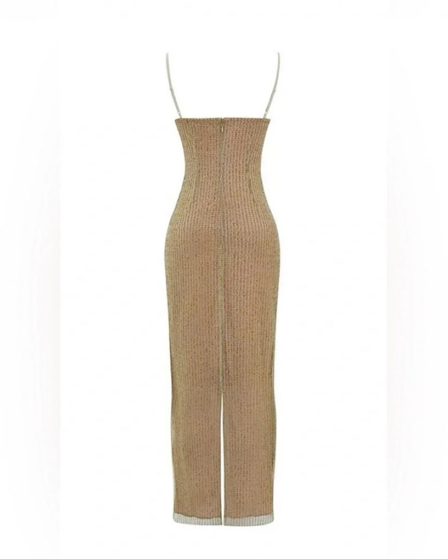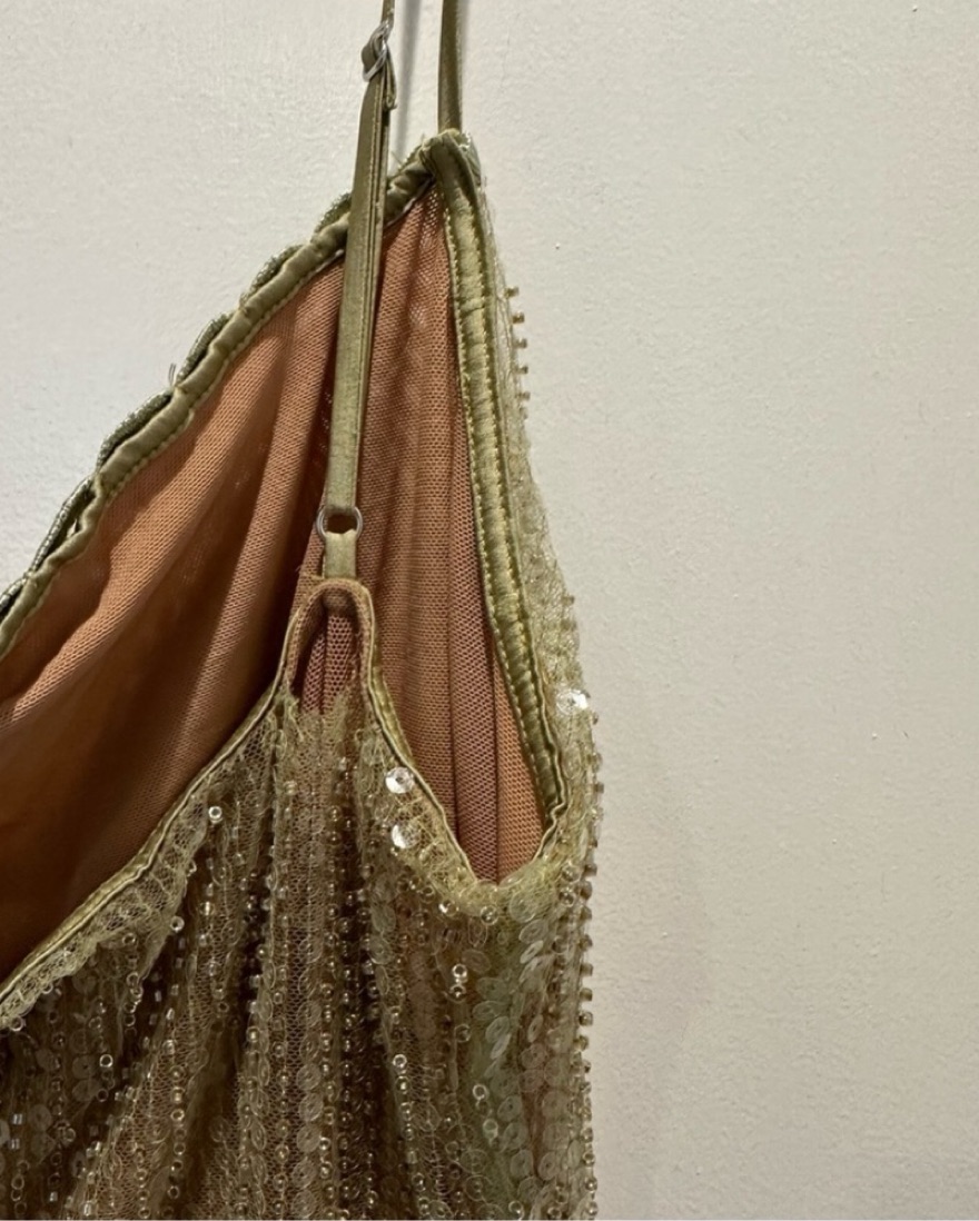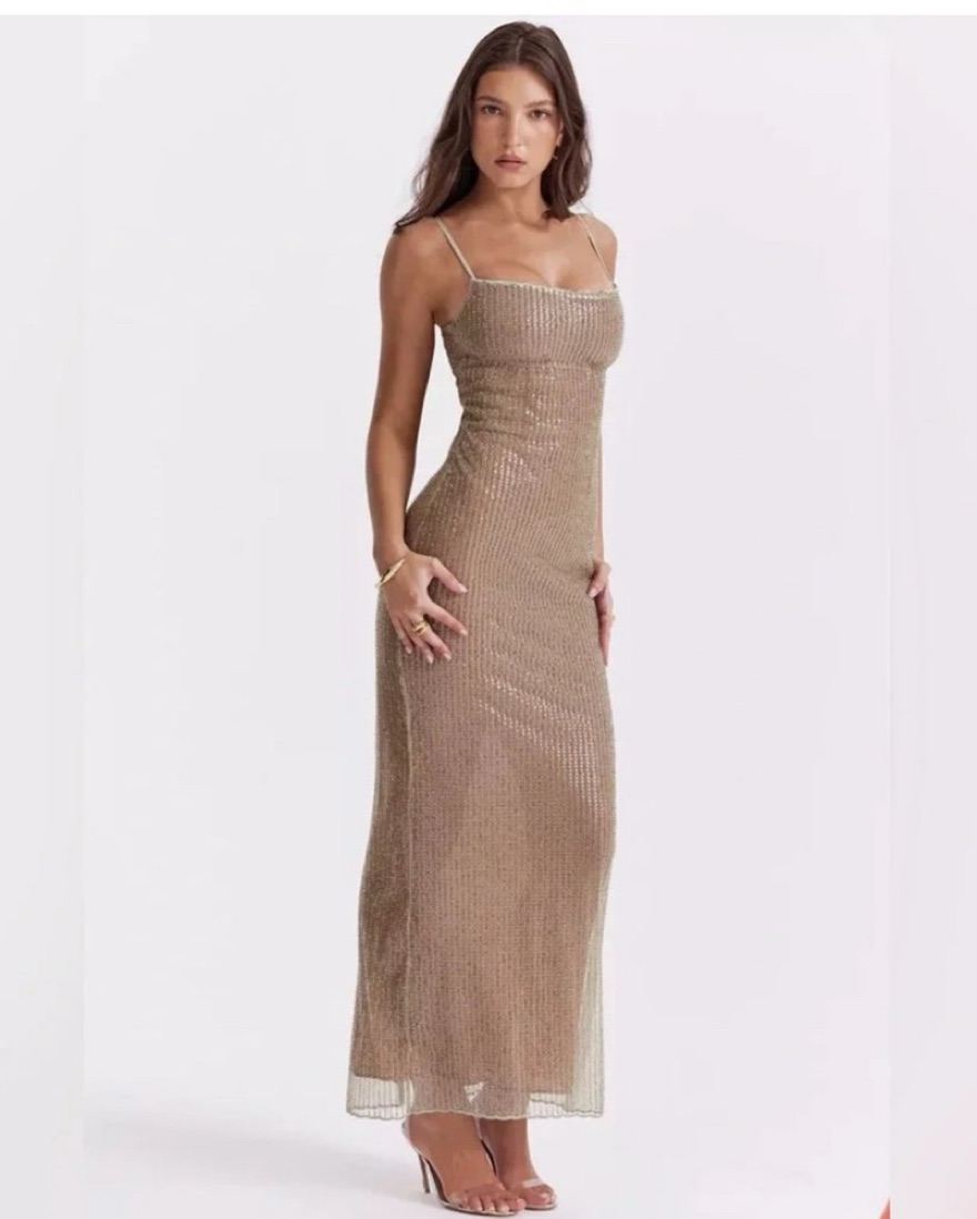 HOUSE OF CB 'Alondra' Cafe Au Lait Beaded Maxi Dress. Green embroidery on a fitted embellished maxi dress.