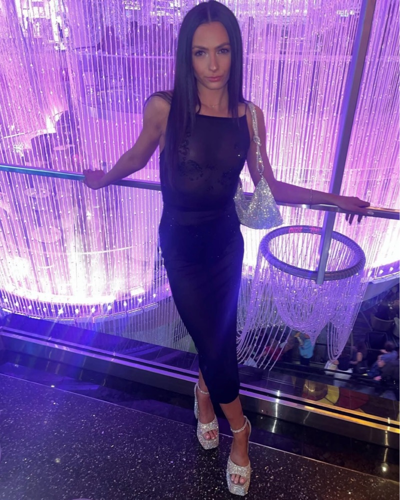 Black sheer evening dress, crystal embellishment, midi length