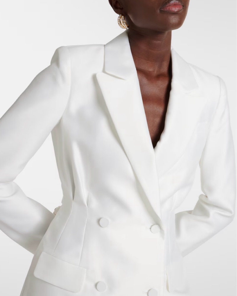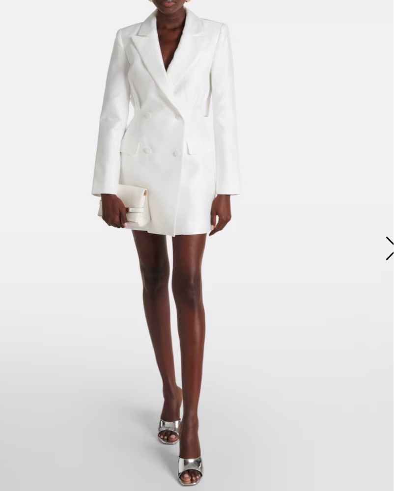Ivory double breasted blazer dress with back cut-out. Perfect for bridal or holiday events.