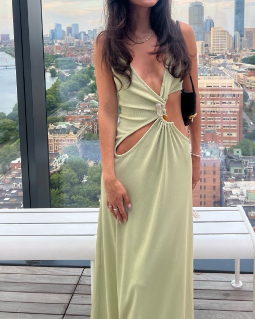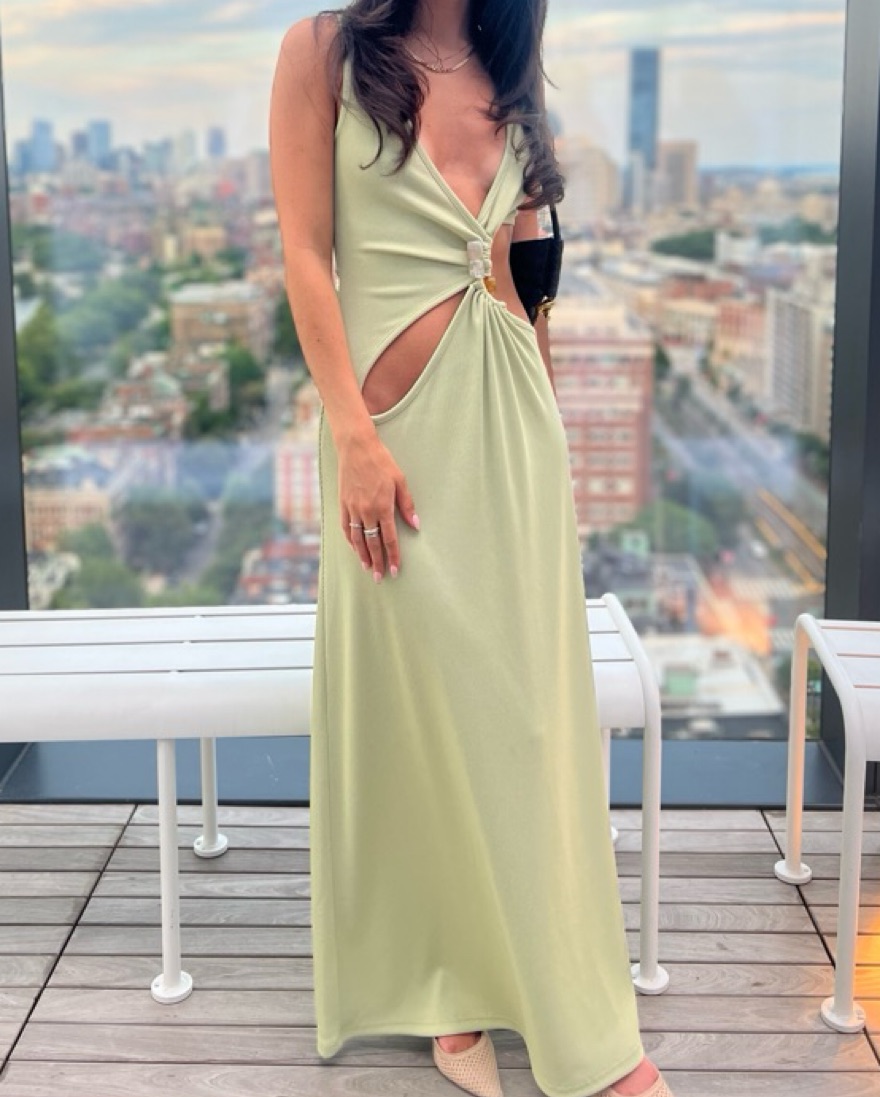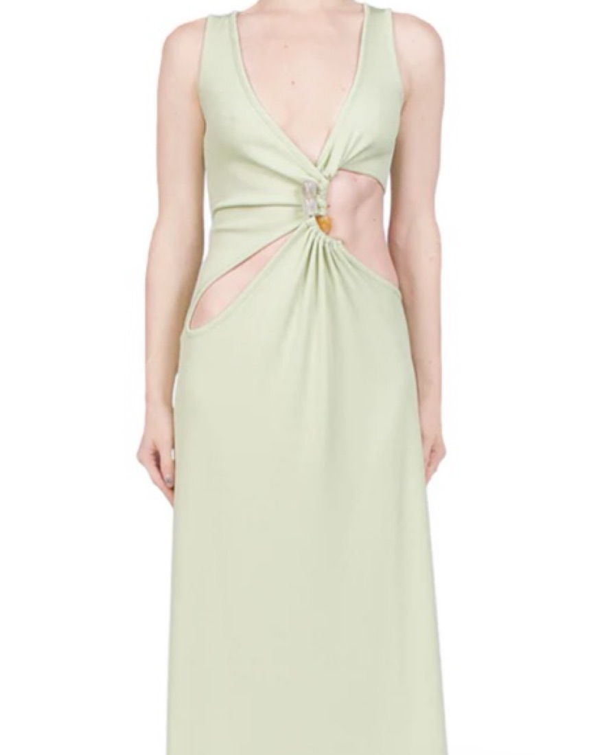 Mint color. Intricately cutout dresses like this one put Christopher Esber on the map. Made from ribbed-knit in a soft 'Pistachio' tone, this maxi style has a plunging V-neckline embellished with colorful stones. Balance the bold design with simple accessories.