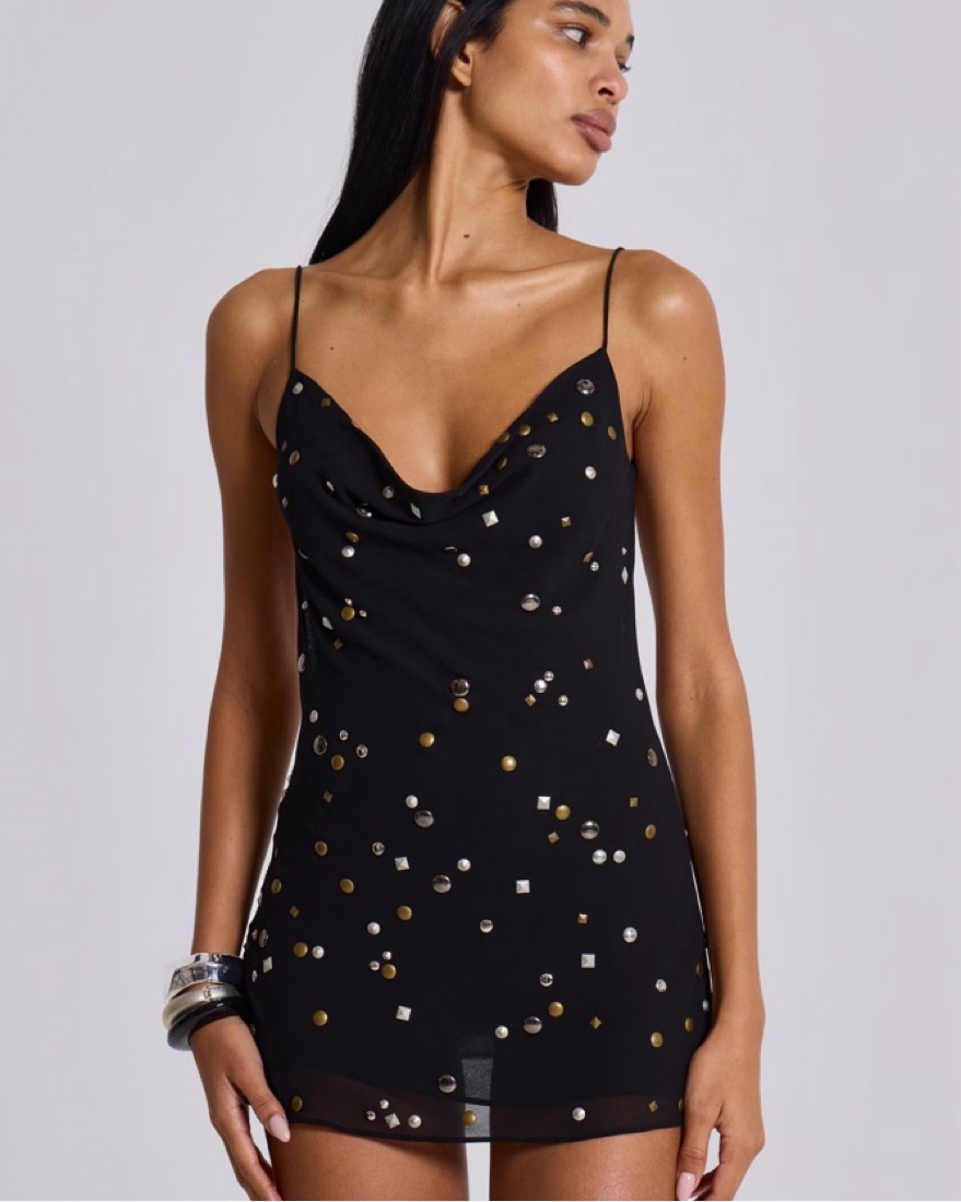 Black studded dress, open back, cowl neck