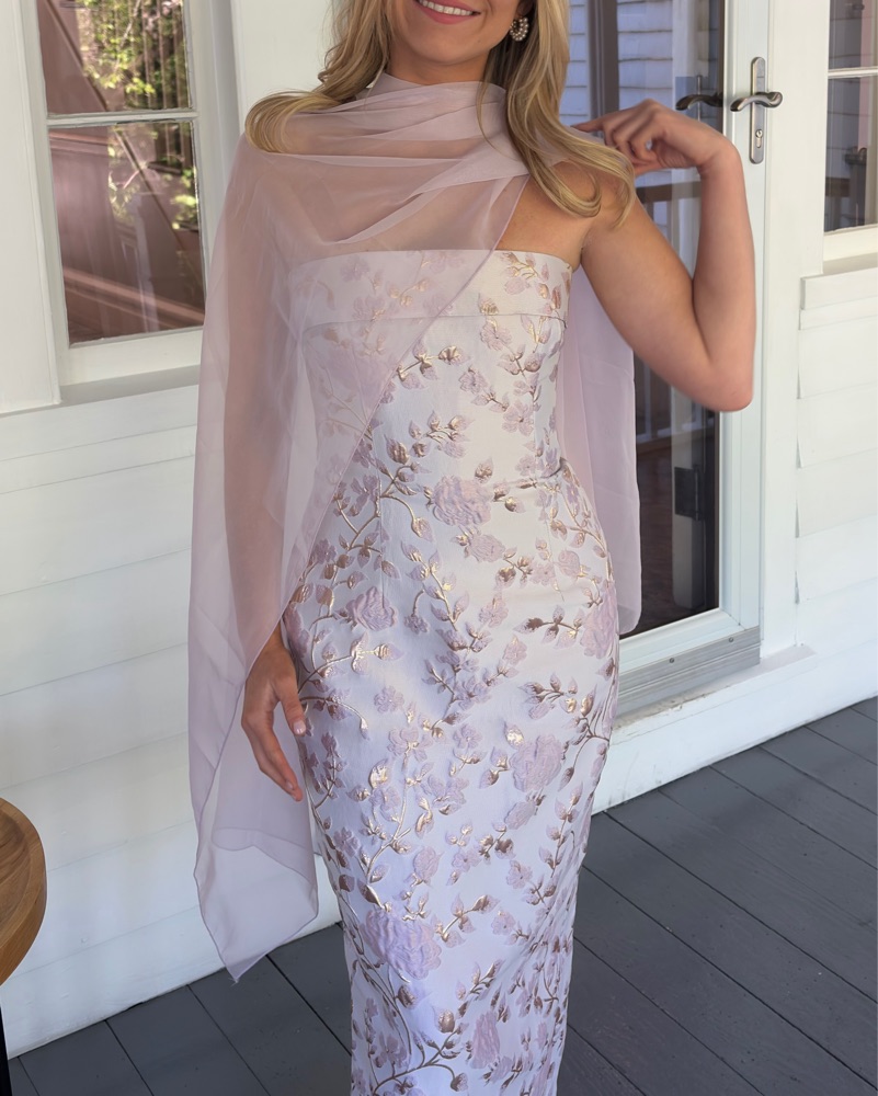 Sau lee lavender dress with a lavender pashmina that matches (was purchased separately). Perfect for spring wedding. Dress is a size 2 but was altered to be tighter in the bust.