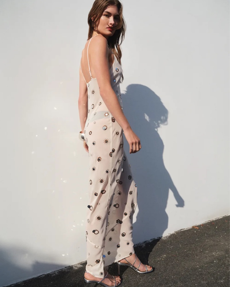 Designed to have a slim fit throughout. Adjustable straps, scoop neckline. Unlined, sheer.