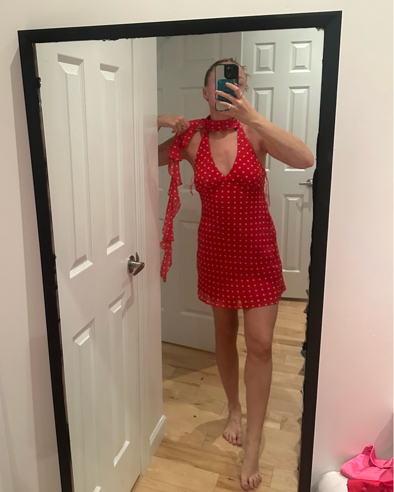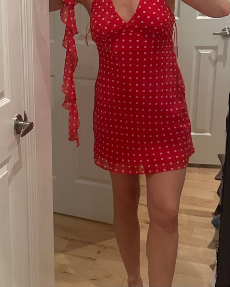 This vibrant red and white polka dot dress is perfect for a summer garden party or outdoor brunch.