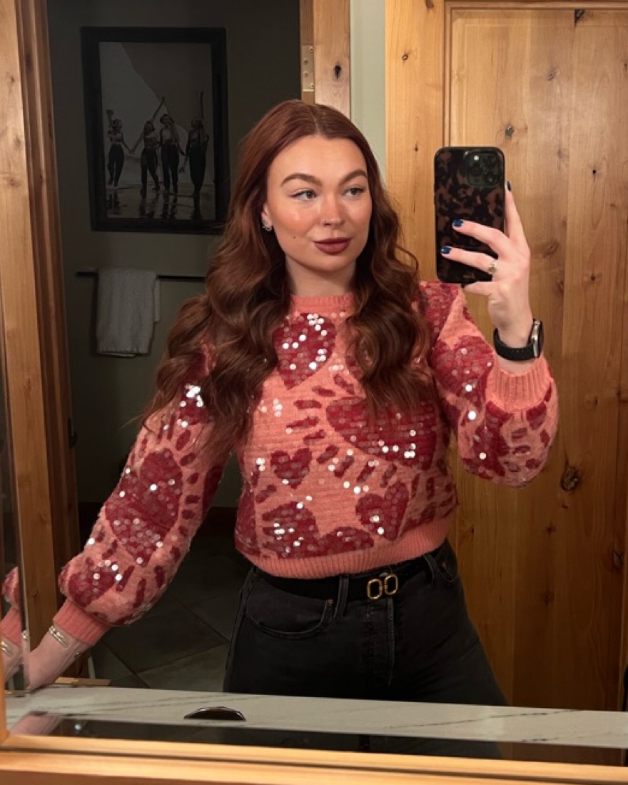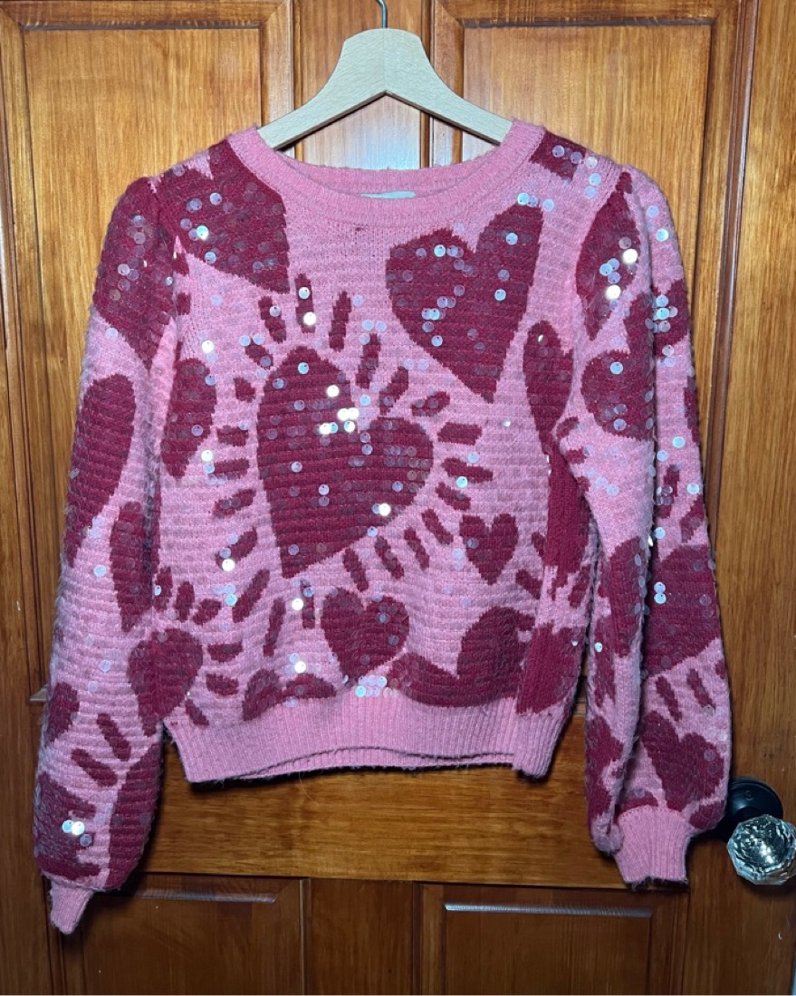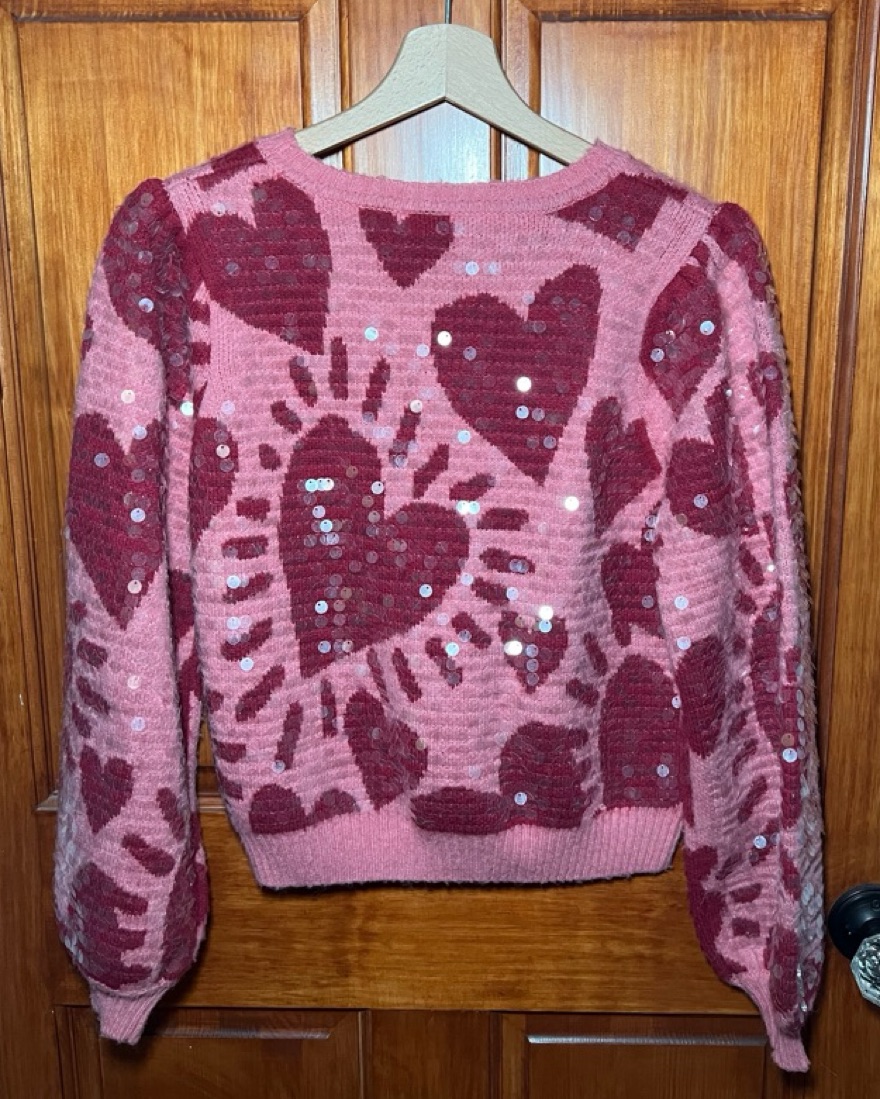 This vibrant sequined sweater is perfect for a fun night out or holiday party. The allover heart print and shimmering details create a playful and eye-catching look.