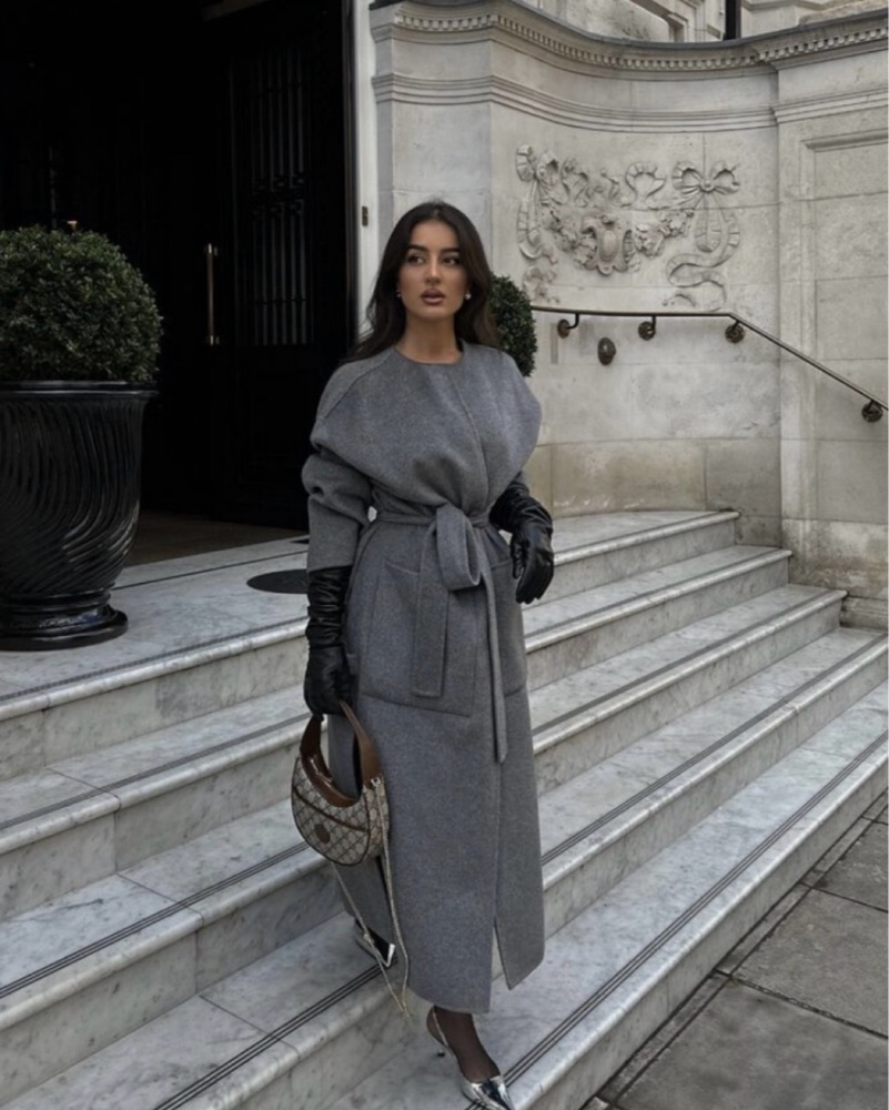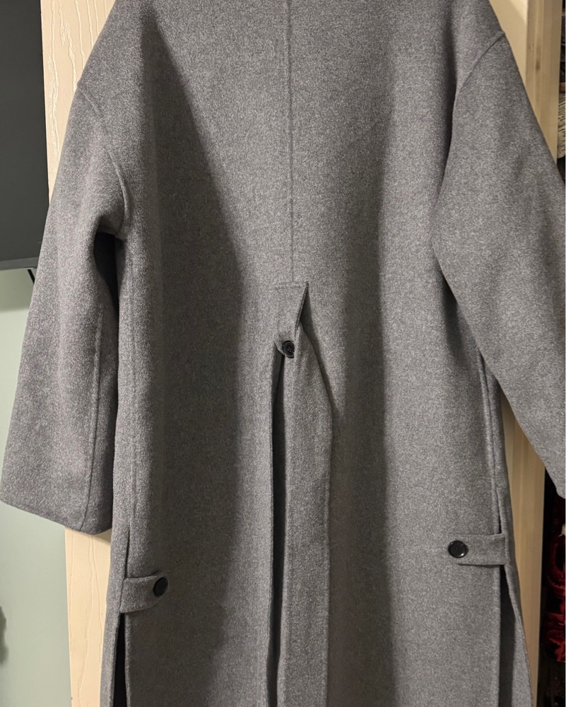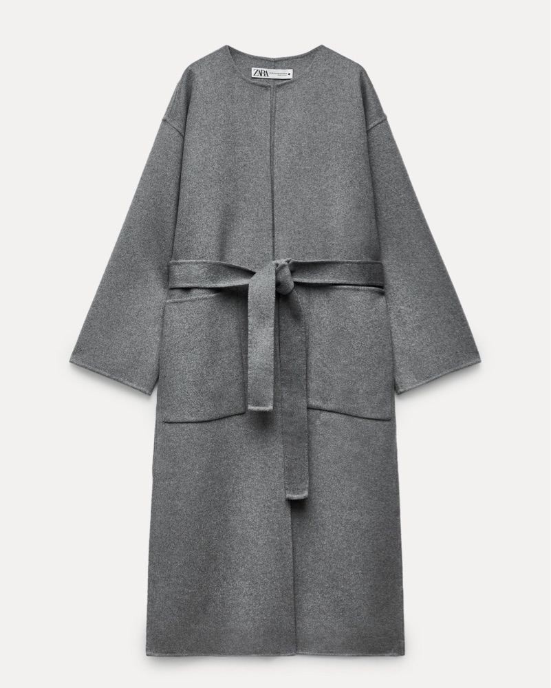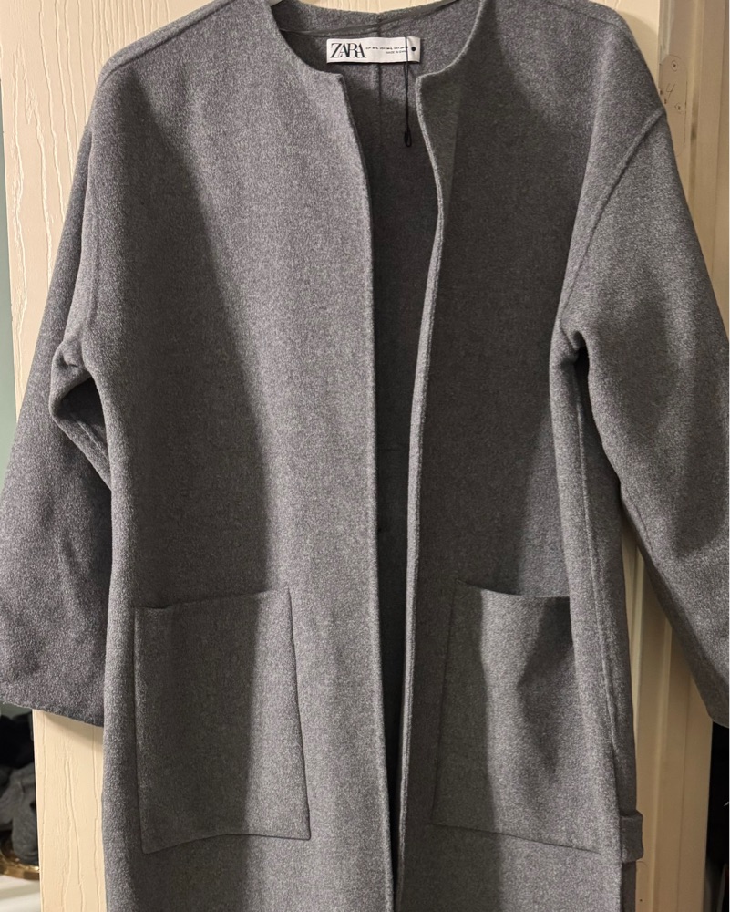 This elegant gray coat from Zara features a flowing design with a wide, open collar and a matching fabric belt for a sophisticated look. Its long length and loose-fitting sleeves offer both comfort and style. If interested in buying, the coat is brand new, never worn but it doesn’t have tags.