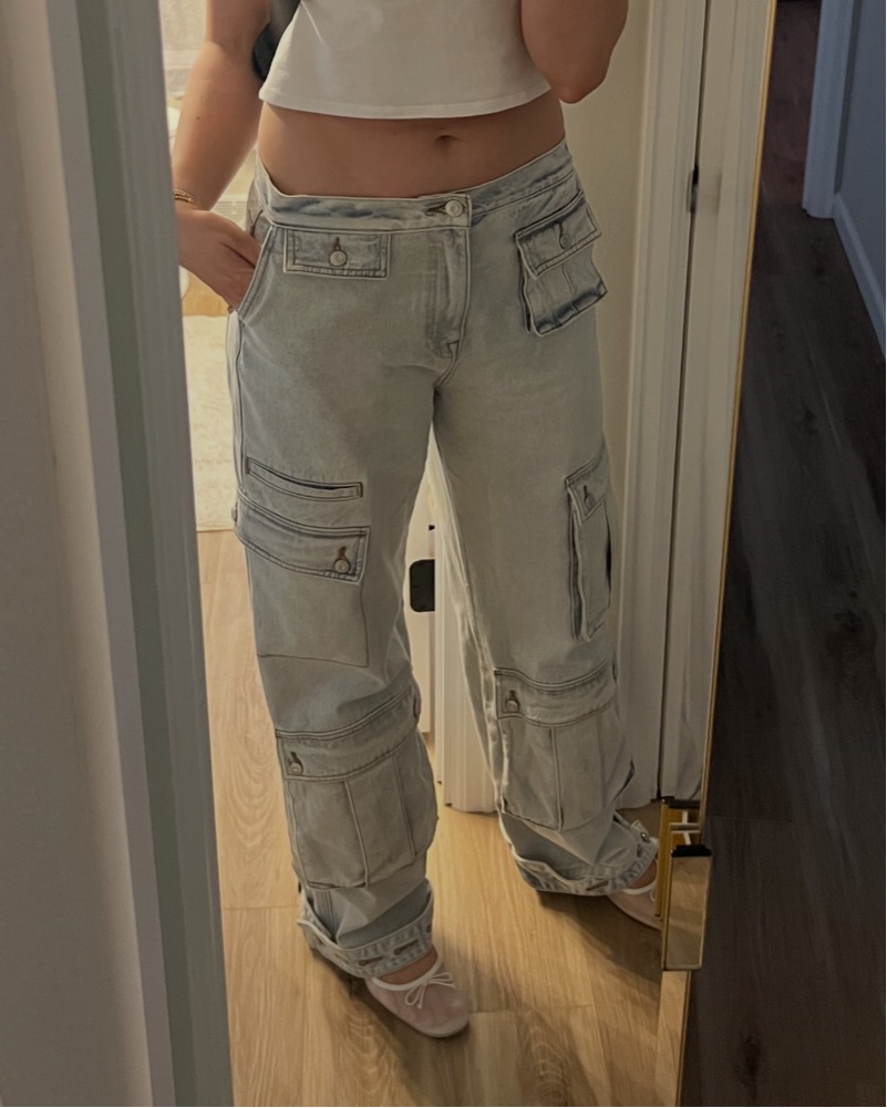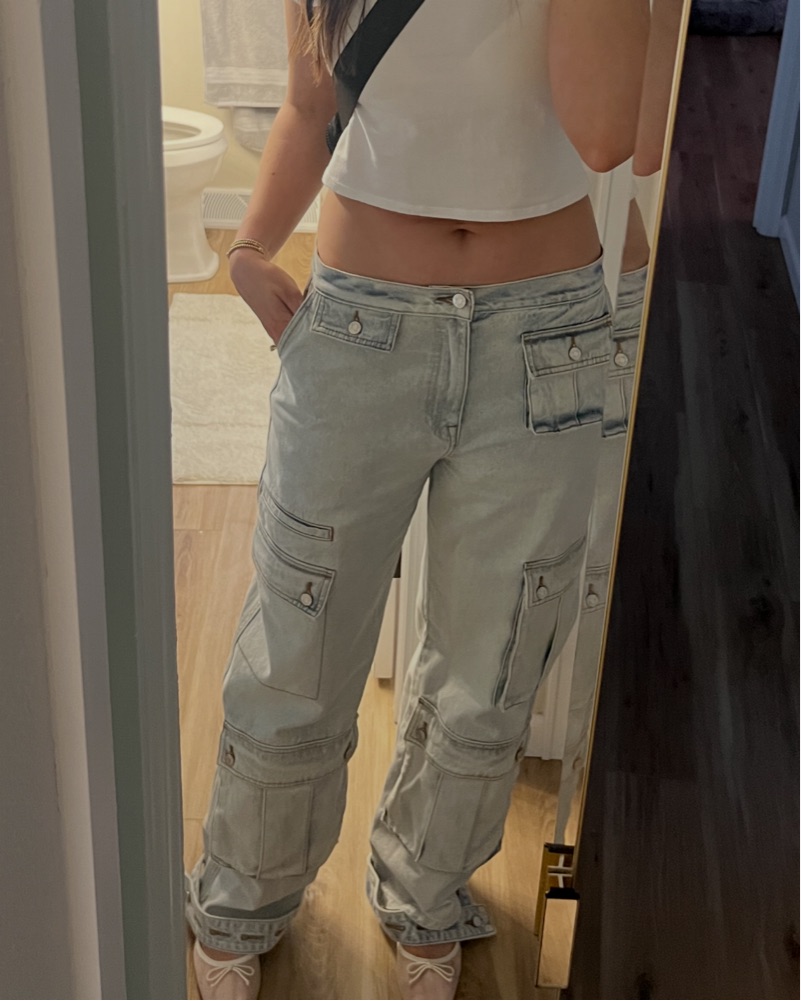 These stylish cargo-inspired denim pants are perfect for adding a chic, casual-cool vibe to your wardrobe. Pair them with a simple tank top and sneakers for a relaxed daytime look.