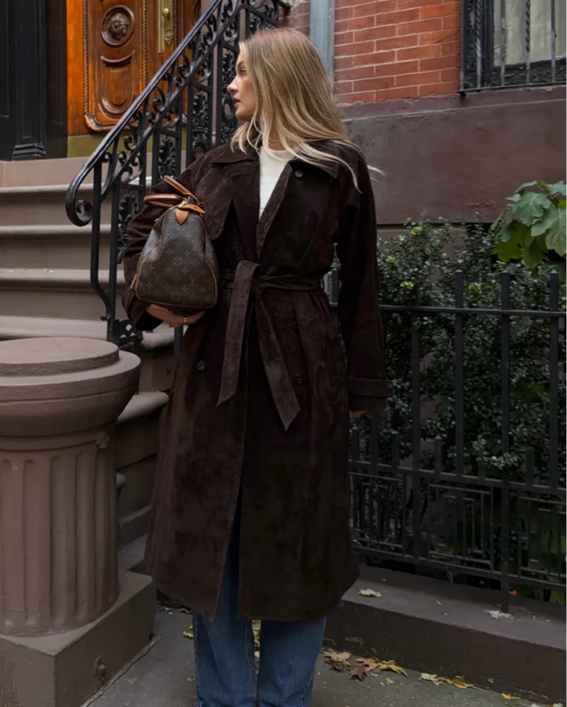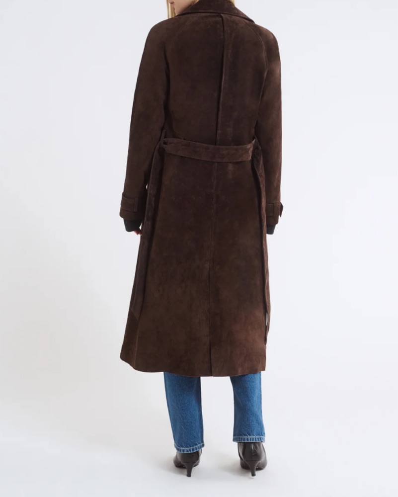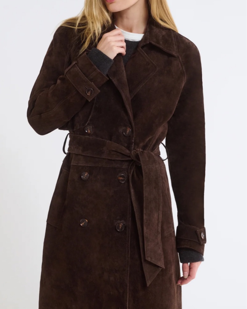 Gorgeous brown suede trench. Would be perfect for size xs-medium depending on desired fit!