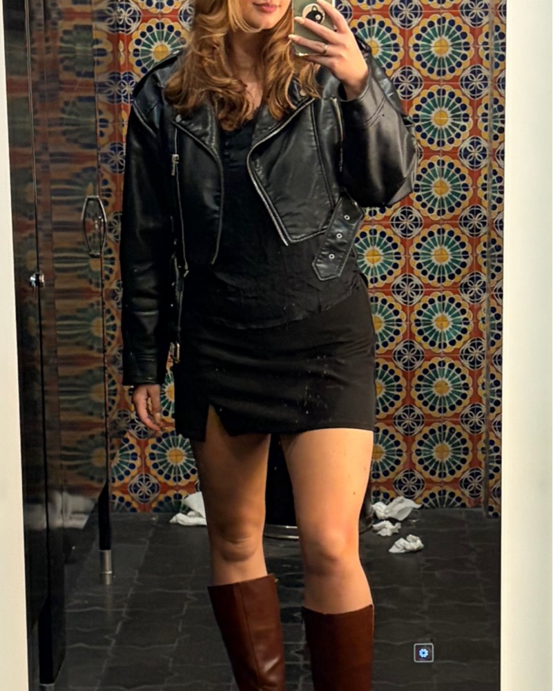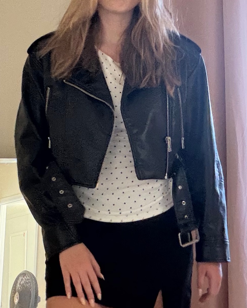 Cropped black leather jacket from Zara! Super cute, zips up with pockets and a belt.