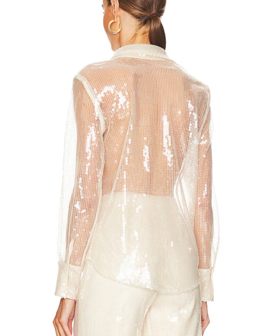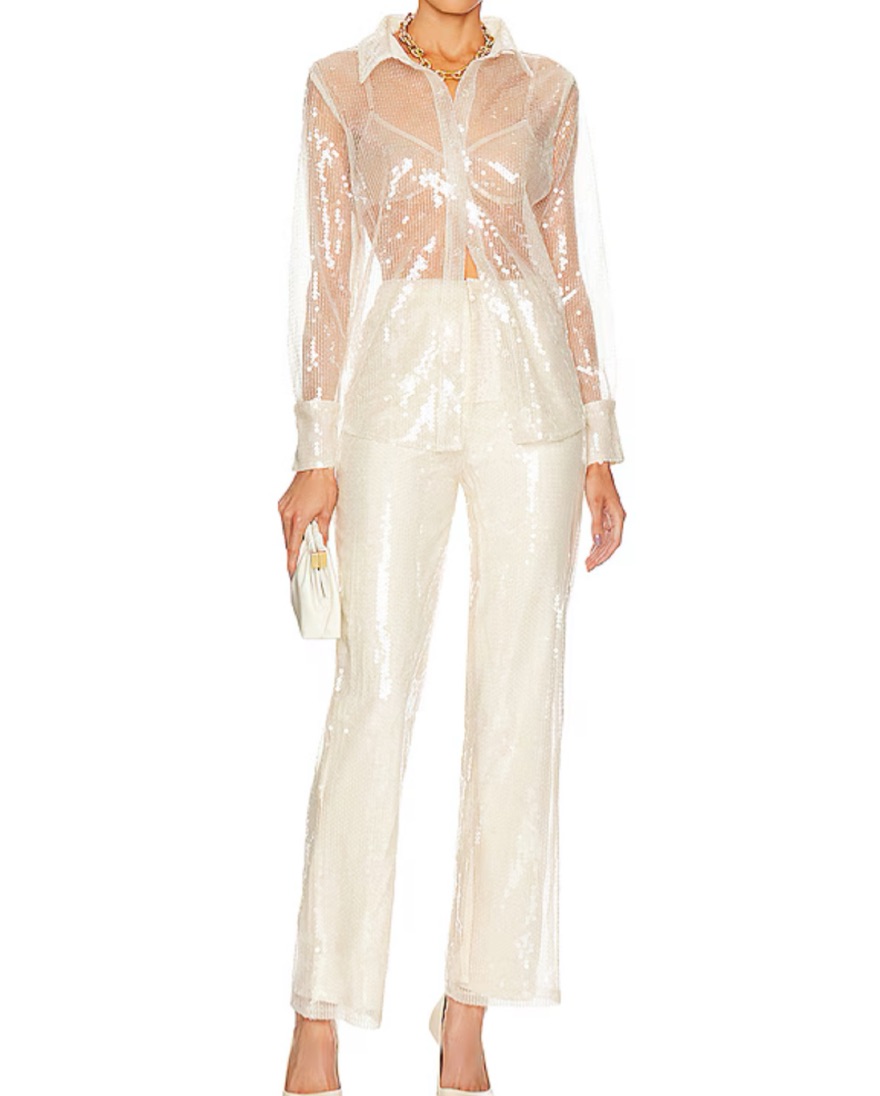 Sheer sequin white pantsuit perfect for Halloween, bachelorette, holiday parties.