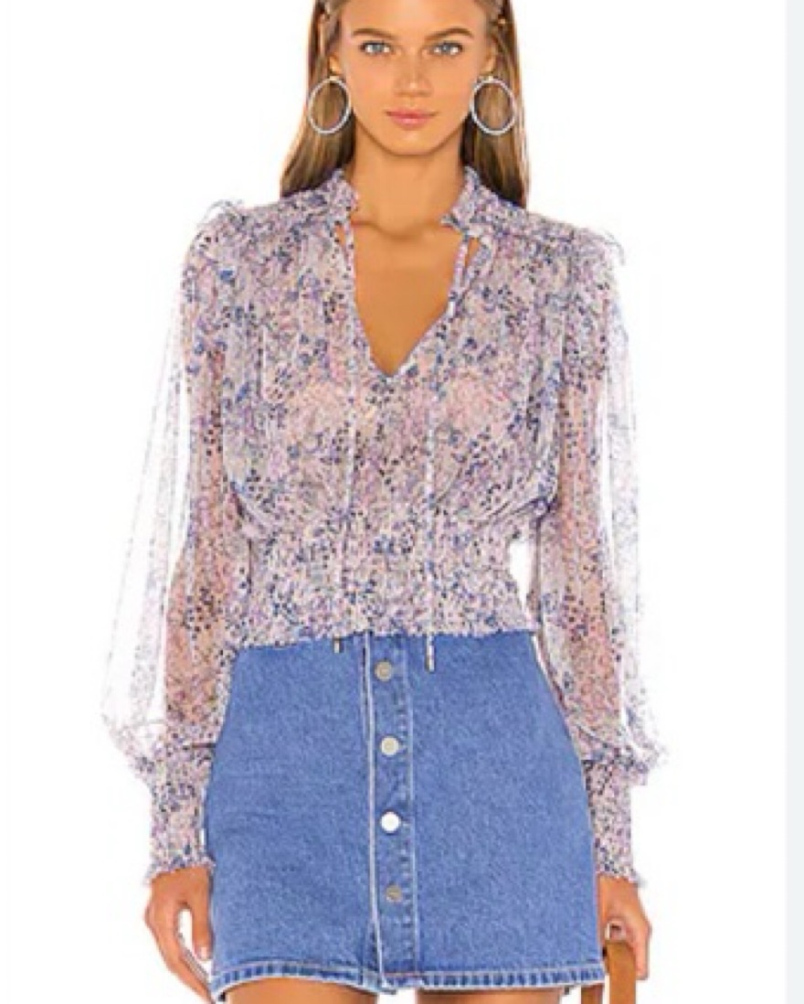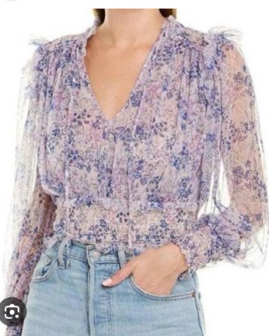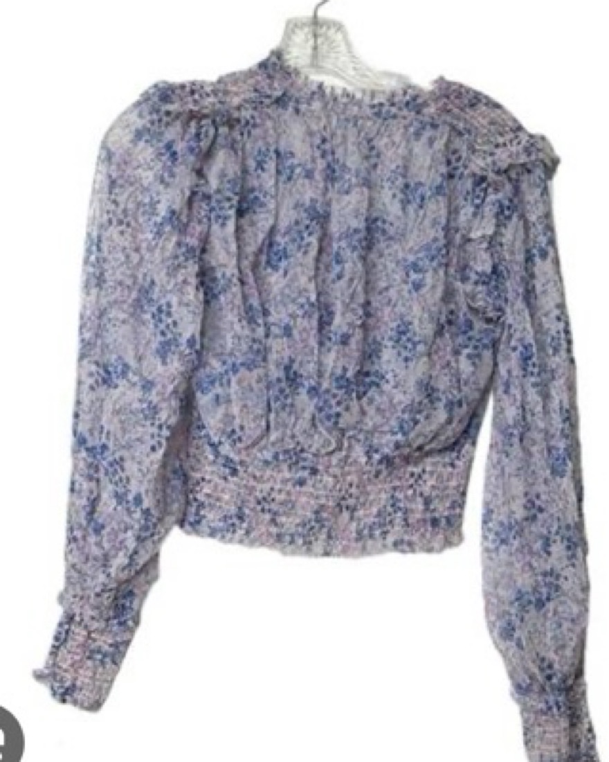 So pretty floral print top in a sheer mesh design with ruffled & smocking details & a tie neckline. Smocked hem & cuffs Unlined, sheer design Double-layer mesh This top is sheer & will need to be layered. Due to the stretchy smocking details, I think this could work for a small-medium as well. I