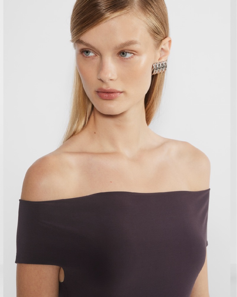This chic off-the-shoulder maxi dress is perfect for a formal event or special occasion. The figure-flattering silhouette and luxurious fabric create a sophisticated look. Color is a very dark purple almost brown and super pretty