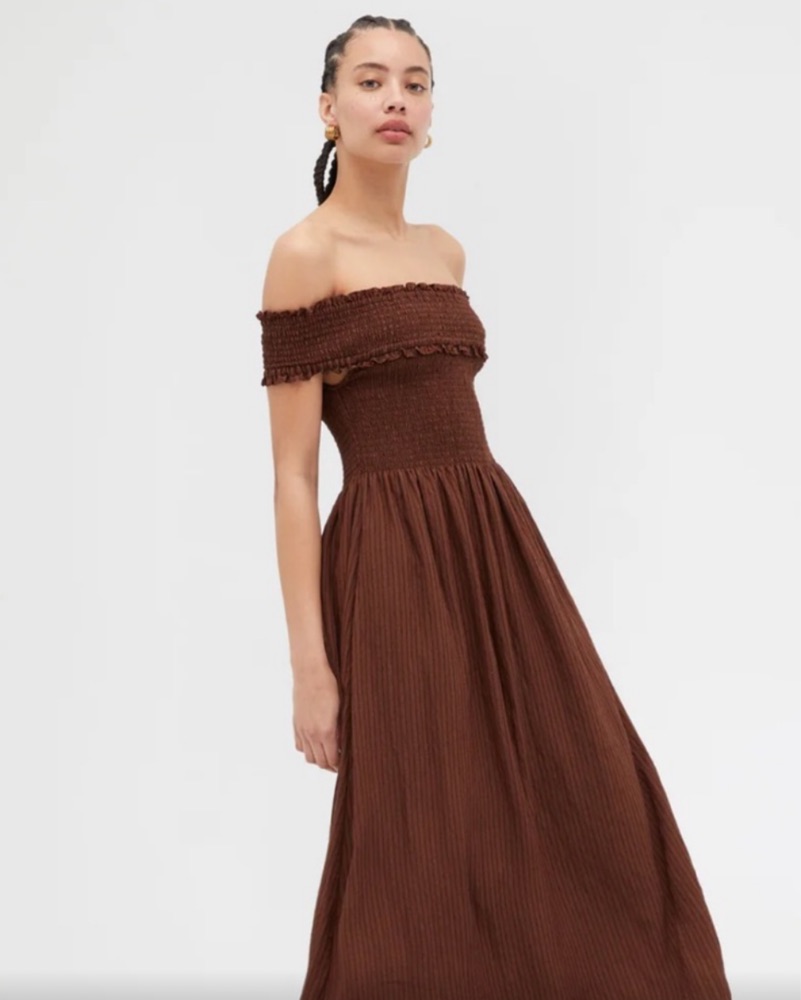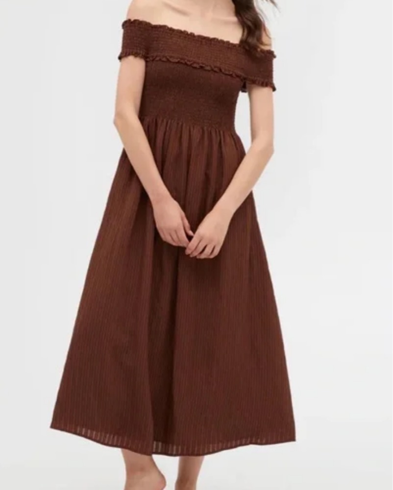 Hill house brown linen off the shoulder dress perfect for the summer