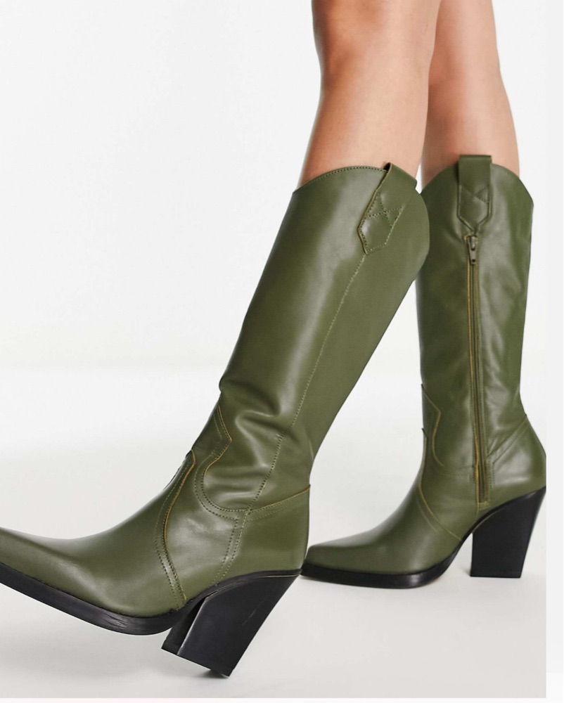 Tall western cowboy boots in olive green. Pristine condition only worn once! Pointed toe but still comfortable. Heel is about 3.5 inches