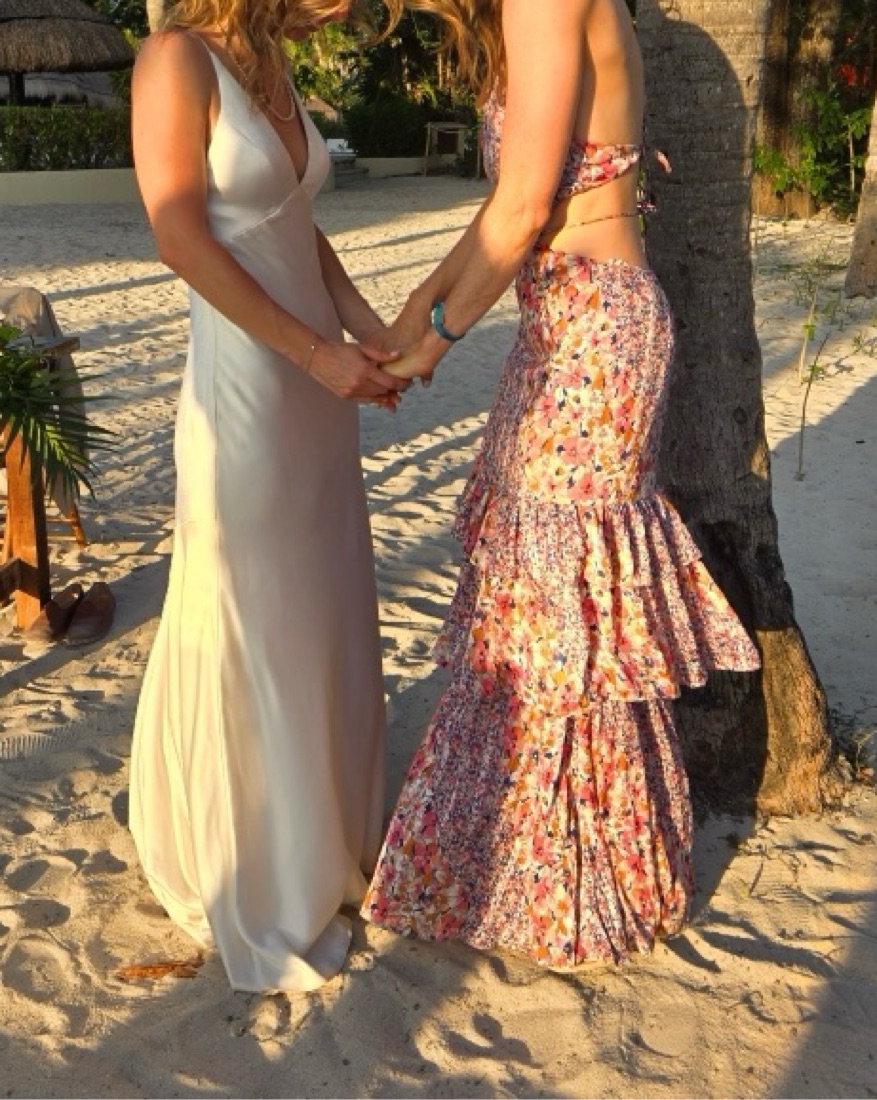 Pink and purple floral maxi gown with ruffle layers and back cutouts. Purchased for a beach wedding in mexico. Dress is light weight and ties in the back. Perfect for travel because it doesnt wrinkle. i’m 5”5 and wore 2.5” heels.